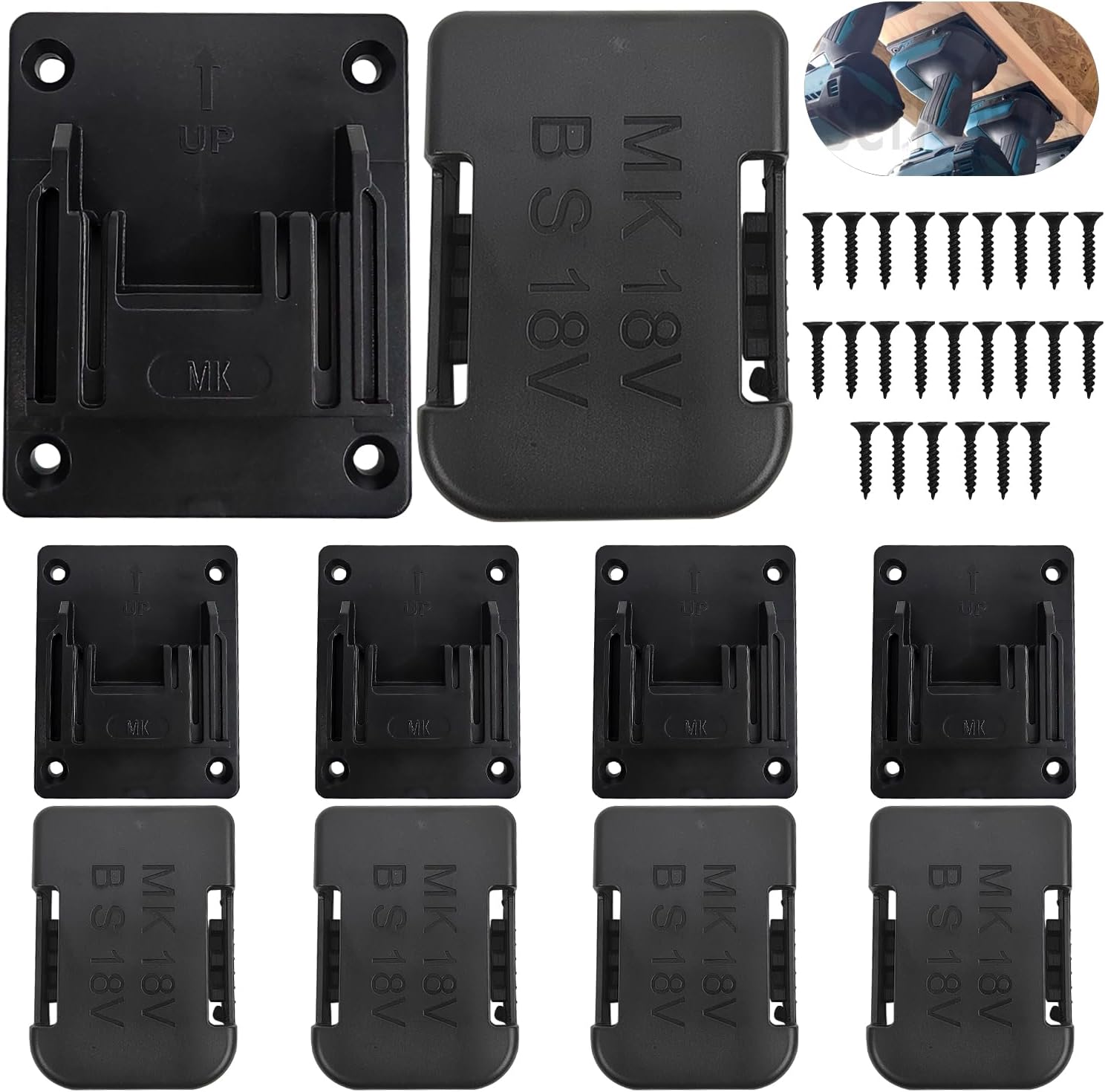 Hallo, Handwerker! Diese 6 SWNKDG Batteriehalter für Makita 18V Akkus (BL1860, BL1850, BL1840, BL1830) bringen Ordnung in deine Werkstatt. Einfach an Wand, Werkbank oder Regal montieren - inklusive 12 Schrauben. Hergestellt aus stabilem ABS-Kunststoff, robust und langlebig. Jeder Halter trägt bis 5 kg. So hast du deine Akkus immer griffbereit und geschützt. Frei kombinierbar oder einzeln verwendbar. Perfekt für Garage, Werkstatt oder Arbeitsfahrzeug. Mach Schluss mit herumliegenden Akkus und schaff dir einen aufgeräumten Arbeitsplatz. Einfach installieren, Akkus einklipsen und freuen - so einfach kann Ordnung sein!