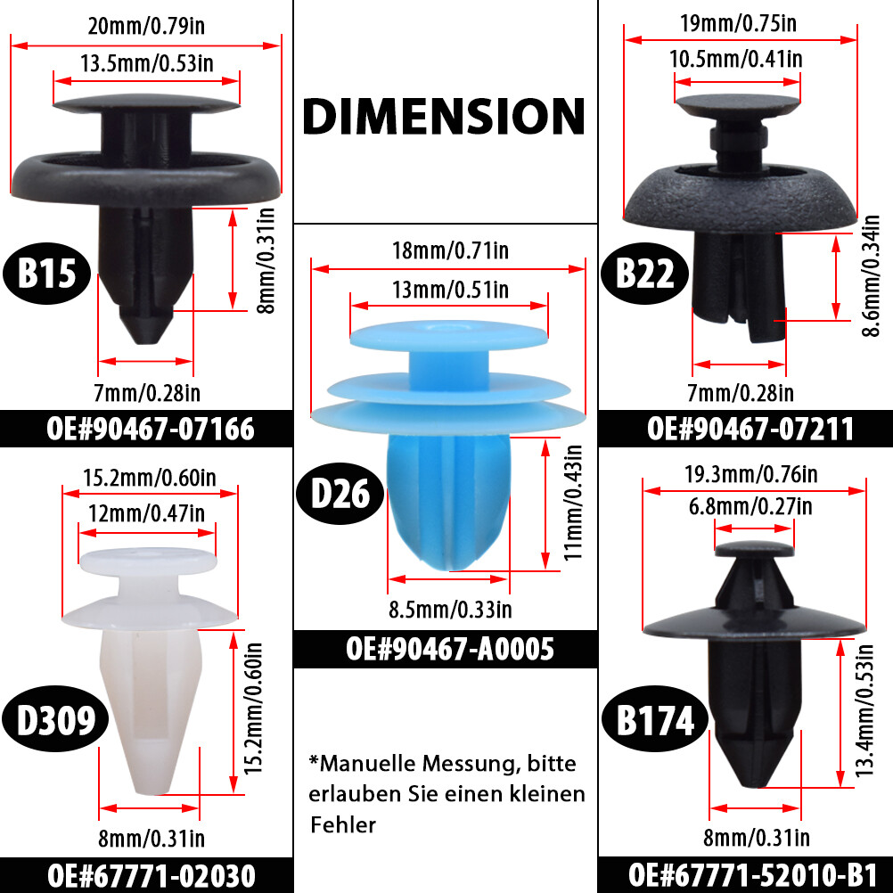Diese Blindniete sind super praktisch für Auto-Reparaturen! Im Set 50 Stück mit 6mm Durchmesser - perfekt für Stoßstangen, Kotflügel und Radkästen. Aus robustem Nylon-Kunststoff, der witterungsbeständig ist. Passt für BMW X3, X5, 3er und viele andere Modelle (OE 51717002953). Einfach ohne Spezialwerkzeug zu montieren - einfach ins Loch stecken und festdrücken. Hält bombenfest und sieht aus wie original. Ob für Profi-Werkstatt oder Heimwerker - mit diesen Nieten machst du nichts verkehrt!