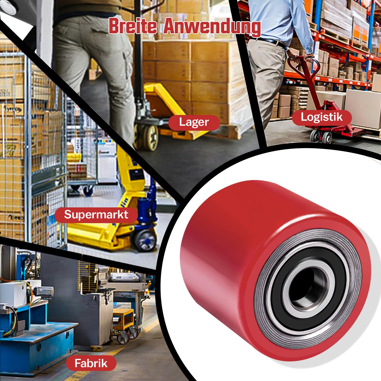 Neue Rollen für deinen Hubwagen! Dieses Set mit 4 Polyurethan-Rollen bringt deinen alten Hubwagen wieder auf Vordermann. Mit 80mm Durchmesser und 70mm Breite - perfekt für die meisten Standard-Hubwagen. Jede Rolle hält bis zu 600kg aus! Die PU-Bereifung ist super schonend für deine Böden und hat einen geringen Rollwiderstand. Mit Kugellager für leichtes Laufen und langlebige Performance. Achsdurchmesser 20mm passt zu den meisten Modellen. Besonders praktisch bei leicht unebenen Oberflächen - die verbesserte Stoßdämpfung macht's möglich. Einfach die alten Rollen abmontieren, neue drauf und schon läuft dein Hubwagen wieder wie geschmiert. Spare dir einen neuen Hubwagen und tausche einfach die Rollen! Deutsche Qualität die hält, was sie verspricht. Perfekt für Lager, Werkstatt oder Betrieb.