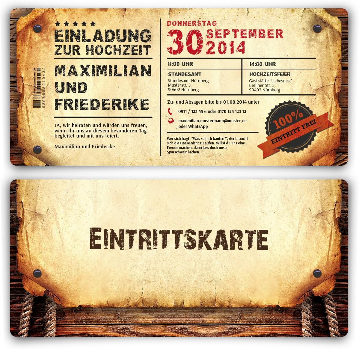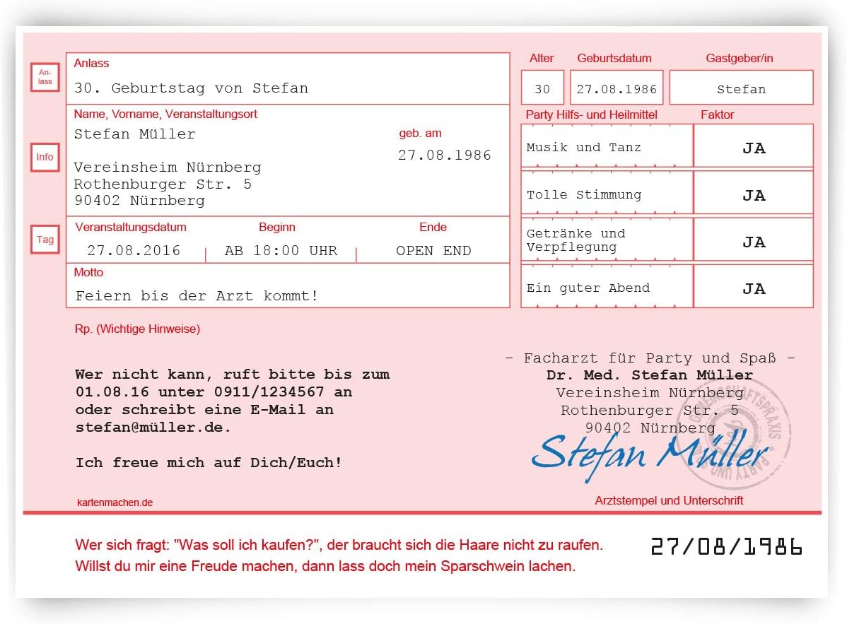 Hey, planst du ne richtig coole Geburtstagsparty? Diese Einladungskarten im Grunge/Vintage-Style sind genau das Richtige! Sie sehen aus wie alte Eintrittskarten mit nem abgerissenen Look - total individuell und stylisch. Format DIN Lang (210x98mm), gedruckt auf hochwertigem 300g/qm Papier mit abgerundeten Ecken. Das Besondere: Es gibt nen praktischen Abriss mit allen wichtigen Infos, den deine Gäste wie ne Visitenkarte behalten können. Dein Text wird natürlich individuell gedruckt und ersetzt unsere Mustertexte. Der Hintergrund ist in Vintage-Beige mit schwarzen und roten Streifen, und auf der Rückseite ist nen cooles Logo mit rotem Stern. Lieferung in 1-2 Tagen - perfekt wenn's mal schnell gehen muss. Mach deine Party unvergesslich mit diesen einzigartigen Einladungen!