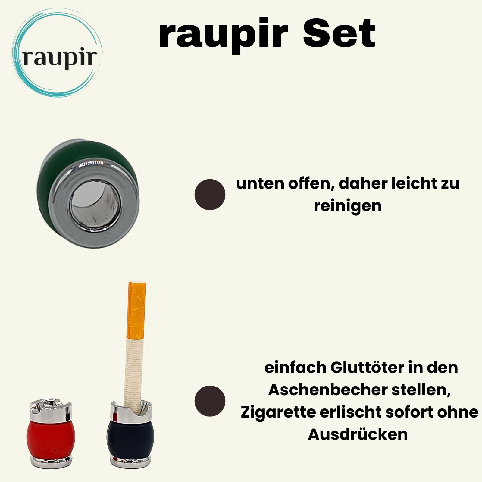 Beidseitig offen - einfach die Zigarette reinstecken, drehen und die Glut ist sicher gelöscht. Verhindert lästiges Glimmen und unangenehme Gerüche.