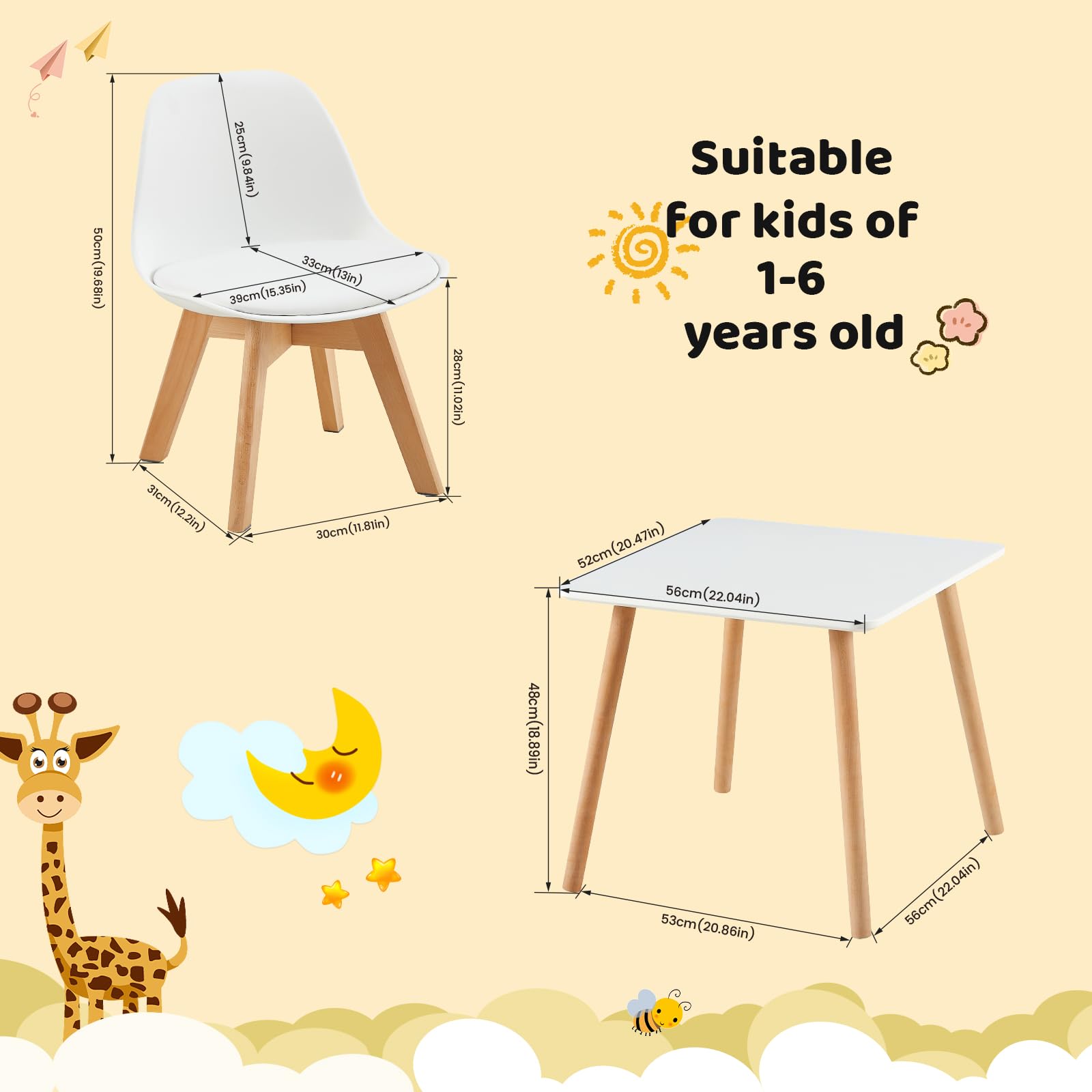 Der eigene kleine Bereich für dein Kind! Diese niedliche Kindersitzgruppe in Rosa besteht aus einem Tisch (56x52x48 cm) und zwei Stühlen (40,5x48,5x52 cm) - perfekt für Kinder von 1-6 Jahren. Aus FSC-zertifiziertem Massivbuchenholz gefertigt, ist das Set super stabil und langlebig. Die abgerundeten Ecken schützen vor Verletzungen und die wasserdichten, gepolsterten Sitzflächen sind leicht zu reinigen. Ideal fürs Malen, Basteln, Essen oder Spielen im Kinderzimmer. Die Stühle lassen sich unter den Tisch schieben, um Platz zu sparen. Ein sicheres und schönes Möbelstück, das die Kreativität deines Kindes fördert und ihm seinen eigenen Bereich zum Wachsen und Lernen gibt!