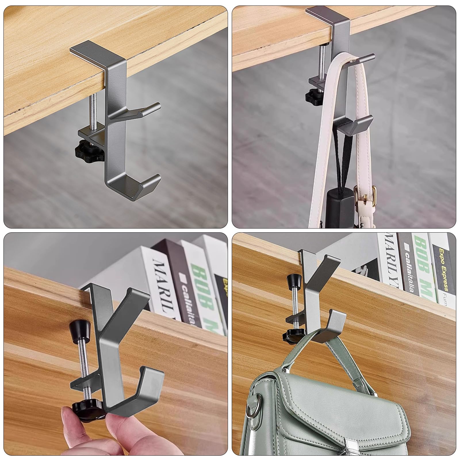 Ordnung auf dem Schreibtisch? Mit diesen 2 Haken wird's easy! Einfach an der Tischkante befestigen - schon hast du dein Headset, deine Tasche oder Schlüssel immer griffbereit. Verstellbar von 1-4,5cm Tischdicke, passt also an fast jeden Tisch. Aus Aluminium, super stabil und langlebig. Die weichen Gummipads schützen deine Möbel vor Kratzern. Das Drehschrauben-System hält bombenfest - nichts wackelt! Perfekt fürs Büro, Gaming-Setup oder Zuhause. Spart Platz und sieht dabei noch stylisch aus. Ob für Kopfhörer, Handtaschen oder sogar Hüte - diese Haken sind die Alleskönner für deinen Arbeitsplatz!