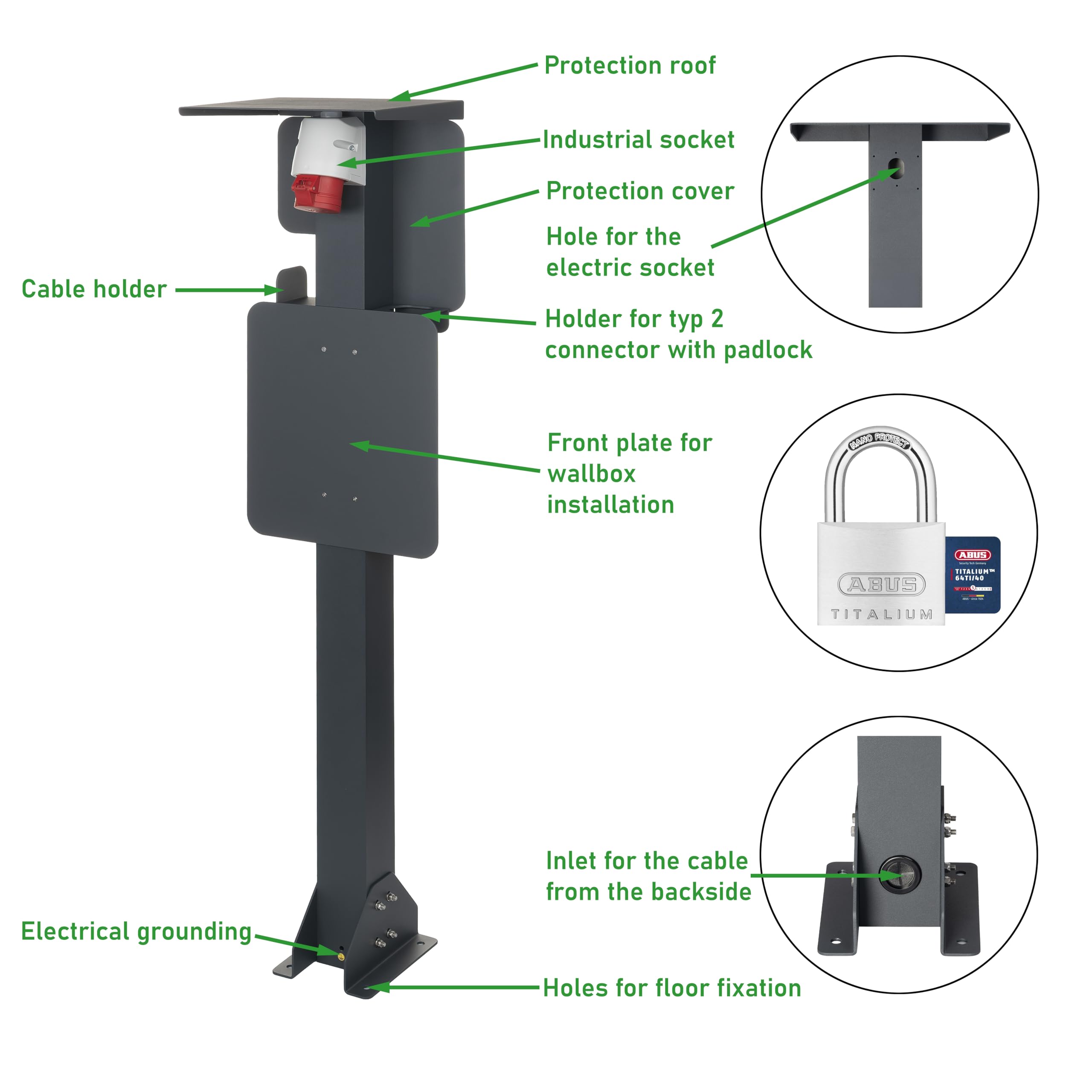 E-Auto Besitzer, hier ist die perfekte Ladestation für draußen! Dieser hochwertige Standfuß aus Aluminium hält deine Ladestation sicher und wettergeschützt. Mit 3-phasiger CEE-Steckdose (16A, 11kW) für schnelles Laden. Das integrierte Dach schützt vor Regen und Sonne, der Kabelhalter sichert dein Ladekabel gegen Diebstahl. Passt für die meisten Ladestationen bis 400x360mm. In Anthrazitgrau pulverbeschichtet - rostfrei und langlebig. Alle Schrauben aus Edelstahl für maximale Haltbarkeit. Ob in der Einfahrt, im Garten oder auf dem Firmengelände - diese Station macht dein Laden sicher und komfortabel. Hol dir jetzt diese professionelle Lösung für dein E-Auto!