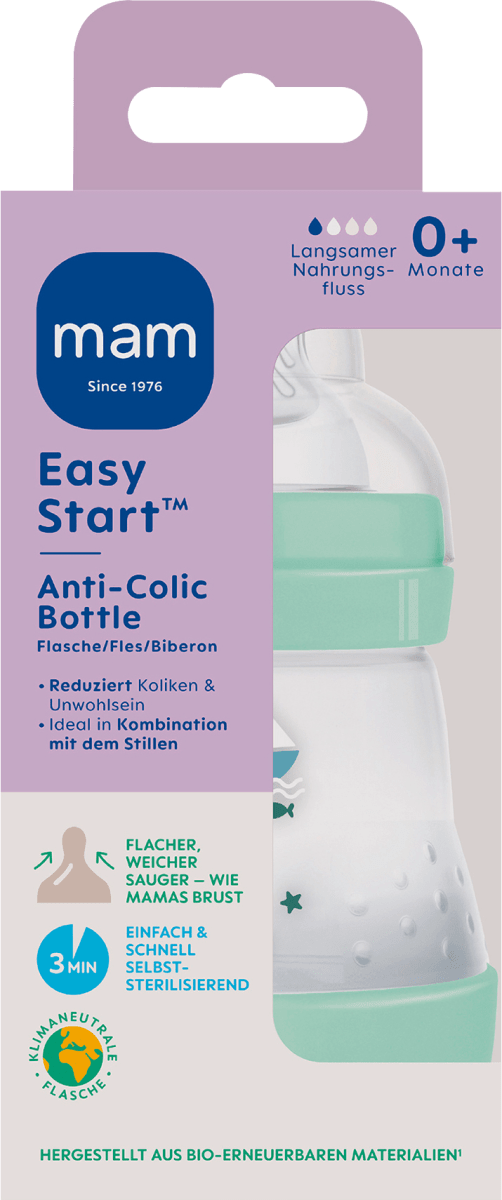 Für alle Eltern, die das Fläschchen geben: Die MAM Easy Start Flasche ist echt genial! Speziell entwickelt, um Koliken vorzubeugen - dank cleverem Ventil am Boden gelangt weniger Luft in den Bauch deines Babys. Der Sauger ist superweich aus SkinSoft Silikon und flach geformt wie eine echte Brust - wird von 94% der Babys sofort angenommen! Perfekt fürs kombinierte Stillen und Flasche geben. Mit 320 ml genau die richtige Größe ab 4 Monaten. Das absolute Highlight: Sie sterilisiert sich selbst in der Mikrowelle - in nur 3 Minuten! Mega praktisch für unterwegs. Die große Öffnung macht das Reinigen super einfach, und die Schutzkappe kann sogar als Messbecher verwendet werden. BPA- und BPS-frei, also absolut unbedenklich. In schönem Beige. Wenn dein Baby oft Bauchweh nach dem Trinken hat, probier diese Flasche mal aus - viele Mütter schwören drauf!