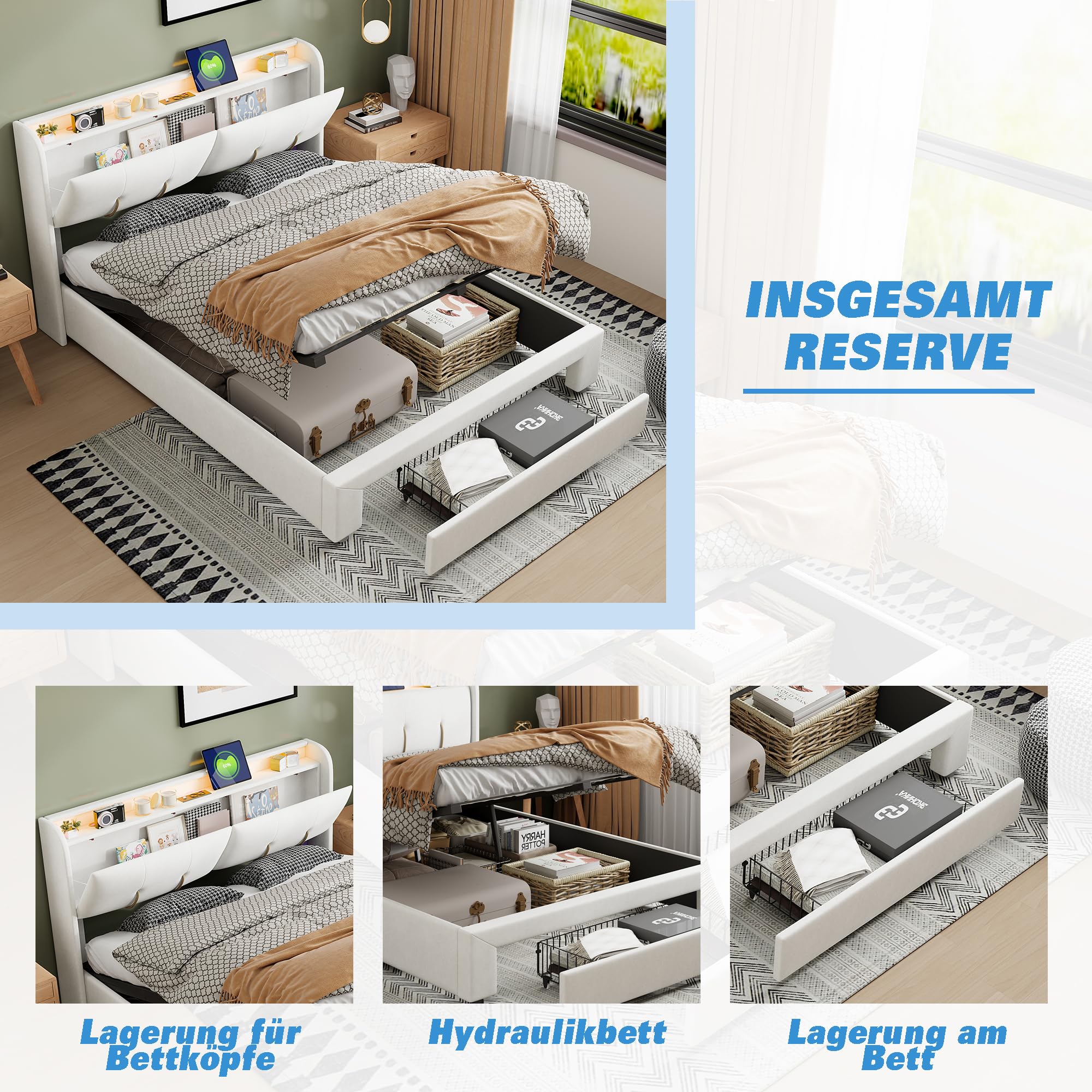 Schlafkomfort trifft auf praktischen Stauraum! Dieses wunderschöne Polsterbett in 160x200cm bietet dir nicht nur einen gemütlichen Schlafplatz, sondern auch jede Menge Stauraum unter der Matratze. Das geniale hydraulische System macht das Öffnen zum Kinderspiel - einfach leicht anheben und der Bettrahmen geht sanft nach oben. So kannst du bequem Bettwäsche, Kleidung oder Koffer verstauen. Das weiche Flanell-Polster fühlt sich super angenehm an und das Kopfteil ist perfekt zum Anlehnen. Das besondere Highlight: Integrierte LED-Beleuchtung an Kopf- und Fußende, die per Fernbedienung dimmbar ist und für gemütliche Atmosphäre sorgt. Modernes Design in Weiß passt zu jedem Einrichtungsstil. Einfach montieren und schon hast du ein tolles Bett mit verstecktem Stauraum - perfekt für kleine Schlafzimmer oder wenn du einfach mehr Ordnung brauchst. Matratze nicht im Lieferumfang enthalten. Hol dir dieses praktische Multitalent!