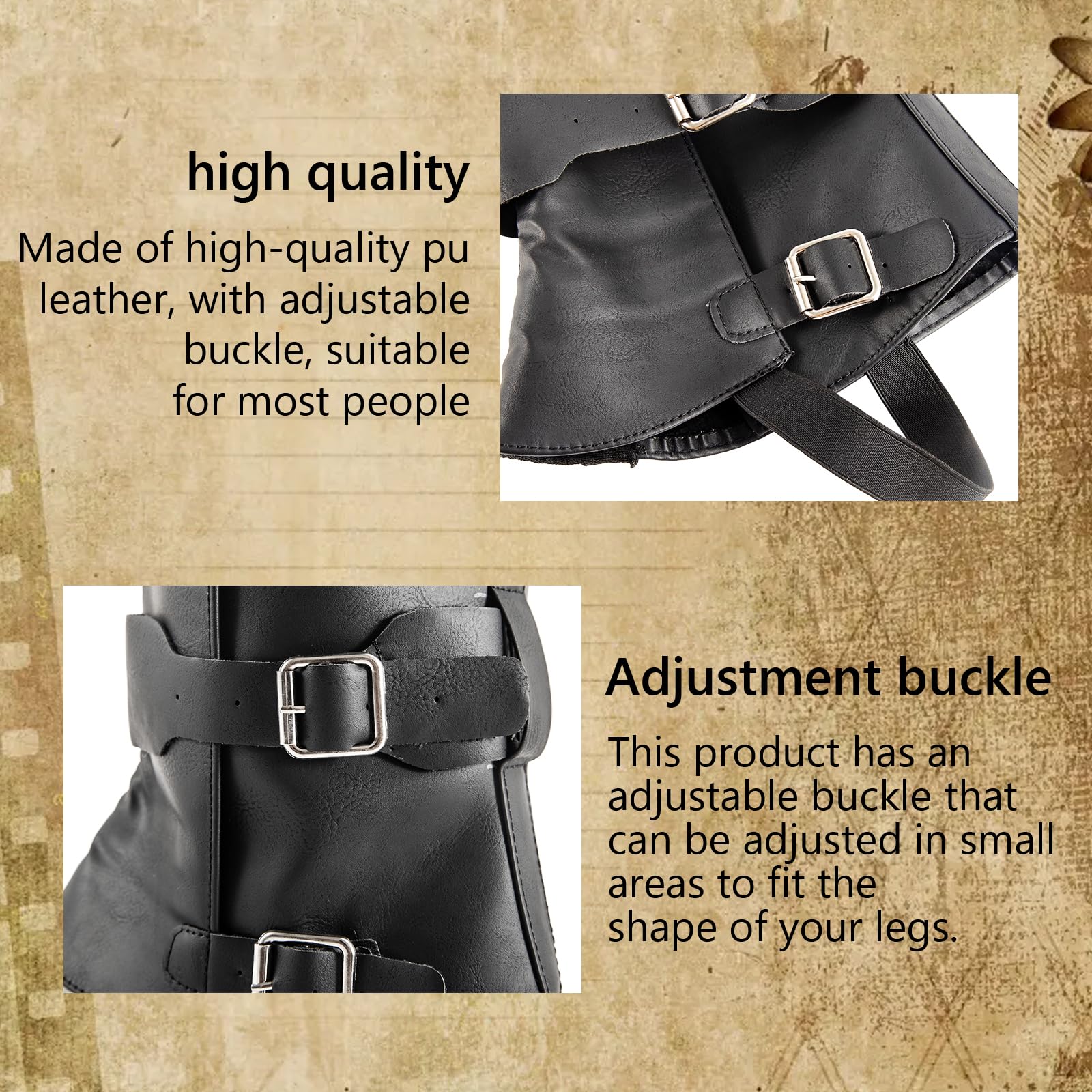 Verwandle deine Stiefel in ein mittelalterliches Meisterwerk! Diese coolen Gamaschen aus Kunstleder geben jedem Outfit den besonderen Kick. Eine Seite mit Schnürung, andere Seite mit 7 Knöpfen - total anpassbar. Matte Leder-Optik - sieht echt aus und fühlt sich wertig an. 40 cm lang - passt über die meisten Stiefel. Verstellbare Wadenbreite - für schmale und breite Waden geeignet. Perfekt für Cosplay, Mittelalter-Feste, Halloween oder LARP. Auch für Theater, Bühne oder besondere Partys. Aus weichem Kunstleder - bequem zu tragen und langlebig. Einfach über die Stiefel ziehen und schnüren - fertig. Macht jedes Outfit sofort episch und einzigartig. Für alle die sich mal wie ein Ritter oder Steampunk-Abenteurer fühlen wollen. Einfach anziehen und in eine andere Zeit eintauchen. Der Hit auf jedem Mittelalter-Fest oder Cosplay-Event!