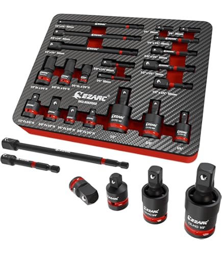 Also, dieses 21-teilige Steckschlüssel-Set von EZARC ist einfach komplett! Da ist alles dabei, was man in der Werkstatt braucht: 11 CR-V Verlängerungen in 1/4, 3/8 und 1/2 Zoll, 3 CR-MO Kardangelenke für enge Winkel, 4 Reduzierstücke und 3 Impact Adapter für den Schlagschrauber. Die Verarbeitung ist absolut top - Chrom-Vanadium und Chrom-Molybdän Stahl, wärmebehandelt, mit schwarzer Manganphosphat-Beschichtung gegen Rost. Die federbelasteten Kugelarretierungen halten bombenfest, aber man kann trotzdem schnell wechseln. Seit ich das Set habe, geht jede Autoreparatur so viel leichter von der Hand - besonders in diesen blöden, schwer zugänglichen Ecken. Kommt in einer praktischen XPE-Schaumstoff-Aufbewahrung, alles schön organisiert und griffbereit. Einfach ein Profi-Set für jeden, der ernsthaft schraubt!