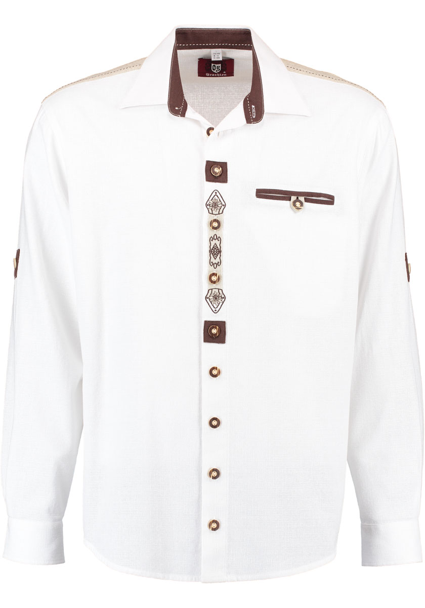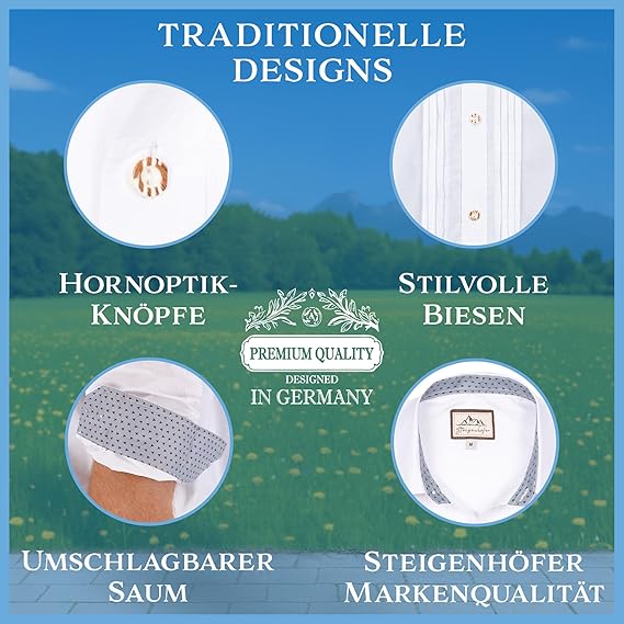 Das klassische Trachtenhemd für echte Wiesn-Fans! Der Steigenhöfer \Valentin\ in Weiß mit traditionellem Stehkragen ist perfekt für Oktoberfest, Volksfeste und Trachtenhochzeiten. Aus hochwertigem Baumwoll-Mix gefertigt - atmungsaktiv und angenehm zu tragen, auch bei langen Festen. Größengerechte Passform, für lockeren Sitz einfach eine Nummer größer bestellen. Mit feinen Hornoptik-Knöpfen und dezenten Mustern im Saum und Kragen. Lässt sich super mit Lederhose kombinieren, aber auch lässig zur Jeans tragbar. Ein zeitloses Design, das Tradition und Modernität vereint. Ob auf der Wiesn oder im Alltag - mit diesem Hemd bist du immer perfekt gekleidet. Einfach anziehen und wohlfühlen in qualitativ hochwertiger Handwerkskunst!