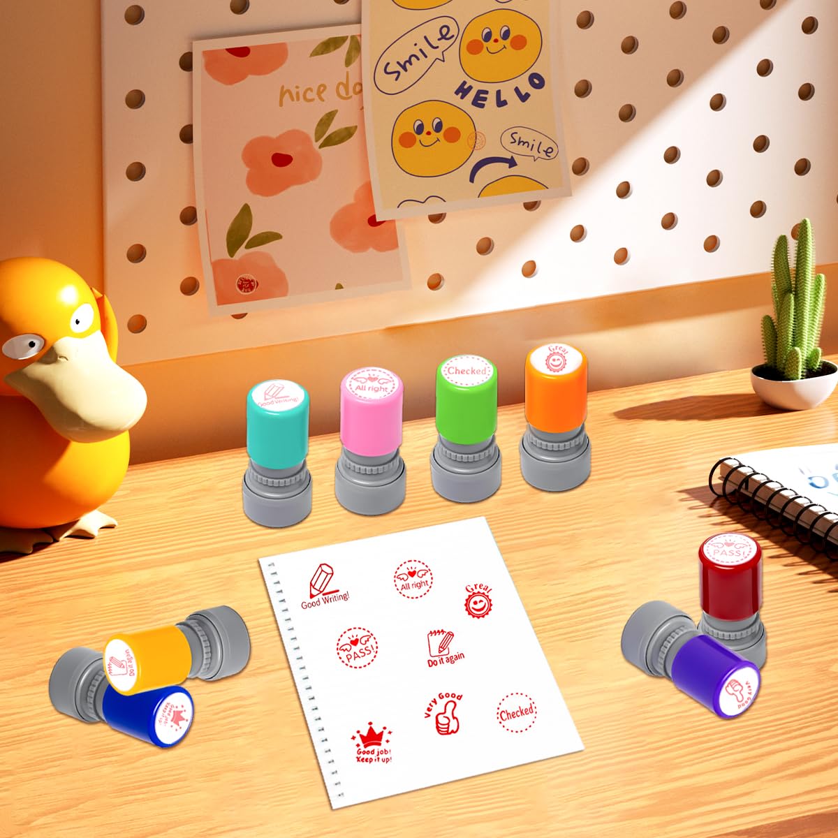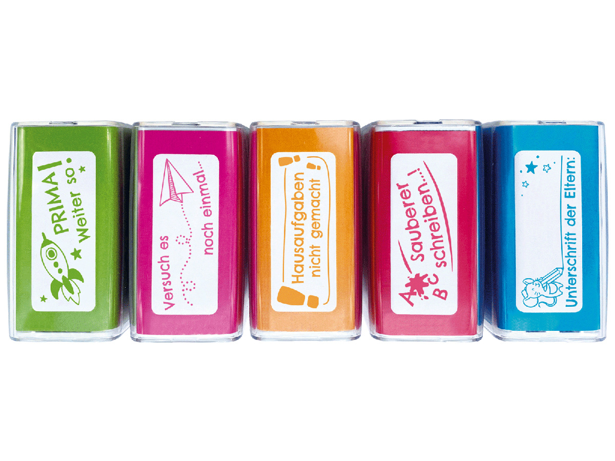 Hey Lehrerinnen und Lehrer! Dieses Stempel-Set ist genau das Richtige für euren Unterricht! 8 verschiedene Motivationsstempel mit süßen Cartoon-Motiven und aufbauenden Sprüchen. Aus robustem ABS-Kunststoff - hält den Schulalltag locker aus! Jeder Stempel hat nen praktischen Deckel, damit die Tinte nicht austrocknet. Tinte trocknet super schnell und hinterlässt klare Abdrucke. Perfekt für Hausaufgaben, Tests oder um Schüler zu belohnen. Mit Sprüchen wie \Gut gemacht!\ oder \Weiter so!\ - das motiviert unheimlich! Einfach zu handhaben - auch für Kinder geeignet. Super Geschenk für Kollegen oder zum Schulanfang. Mach deinen Unterricht bunter und zeig deinen Schülern, dass du ihre Arbeit wertschätzt! Einfach mal ausprobieren - die Kids werden's lieben!