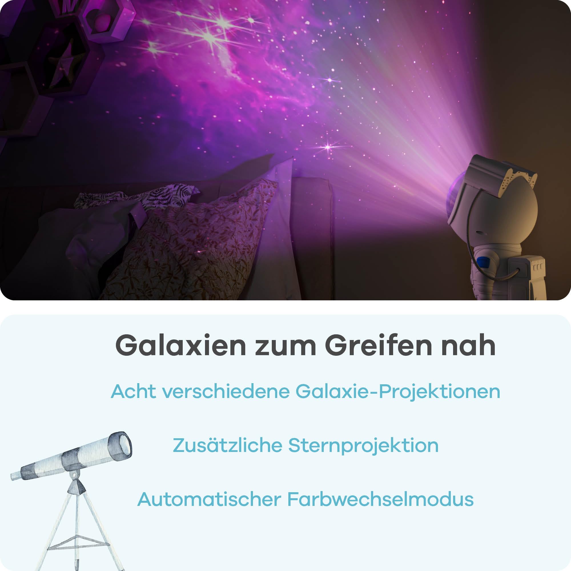 Wow! Dieser Astronaut-Projektor bringt die Milchstraße in dein Zimmer! Mit 26 verschiedenen Modi - 8 Nebelfarben, 5 Helligkeitsstufen, 2 Sternenmodi! Der kleine Mond in den Armen leuchtet in 5 Farben und kann als Nachtlicht genutzt werden. Mit Fernbedienung steuerbar, Timer für 60/120 Minuten - perfekt zum Einschlafen! Der Kopf ist magnetisch und dreht sich 360° - Sterne überall! Sitzen oder stehen - total flexibel! Perfektes Geschenk für Kinder und Erwachsene - für romantische Abende, Partys oder zum Entspannen! 2 Jahre Garantie - kauf ohne Sorgen! Hol dir dein eigenes Universum!