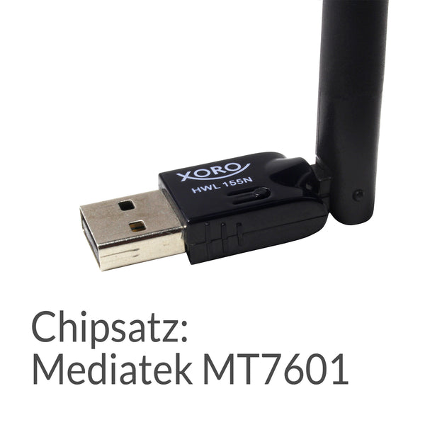Endlich WLAN für deinen PC! Der XORO HWL 155N USB WLAN Stick macht's möglich. Perfekt für Desktop-PCs ohne eingebaute WLAN-Funktion - einfach in den USB-Port stecken und schon bist du online! Mit 150 Mbit/s Surfgeschwindigkeit streamst du Videos und surfst im Internet ohne Ruckler. Das besondere Feature: Die dreh- und neigbare Antenne! Du kannst sie für optimalen Empfang genau ausrichten - viel besser als Sticks ohne Antenne! Super einfach in der Installation: Bei Windows 8, 8.1 und 10 werden die Treiber automatisch erkannt - kein langes Herumgesuche! Auch für Windows 7 gibt's Treiber zum Download. Aber das ist noch nicht alles: Der Stick funktioniert auch mit vielen Linux-Systemen und am Raspberry Pi! Und für alle XORO-Fans: Kompatibel mit vielen XORO-Receivern wie HRS 8590, HRS 8664, HRS 8670 und vielen mehr. Ideal als Ersatz für defekte WLAN-Hardware oder zur Aufrüstung älterer Geräte. Einfach einstecken, kurz warten und schon surft du drahtlos durchs Internet - ohne Kabelsalat!