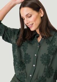 Stylish und bequem - diese Hemdbluse von Street One ist dein neuer Sommer-Liebling! Aus 100% Baumwolle, also super angenehm zu tragen und ideal für warme Tage.👚\n\nDas klassische Hemdblusen-Design mit durchgehender Knopfleiste und Hemdkragen sieht immer elegant aus. Aber der Clou ist die wunderschöne Stickerei am Saum - die verleiht der Bluse eine richtig feminine Note.\n\nDie 3/4-Ärmel sind perfekt für den Sommer: Nicht zu warm, aber auch nicht zu kurz. Und aus reiner Baumwolle ist die Bluse schön luftig und kratzt nicht.\n\nEgal ob im Büro, beim Stadtbummel oder beim Date - diese Bluse passt immer. Kombinierbar mit Jeans, Rock oder Hose - ein echter Allrounder!\n\nStreet One Qualität bedeutet: Gute Verarbeitung, tolle Passform und langlebige Freude. Eine Bluse, die du immer wieder anziehen wirst!\n\n🌿 100% Baumwolle\n🎀 Stickerei am Saum\n👔 Hemdkragen & Knopfleiste\n🌞 3/4-Ärmel für Sommer\n💫 Vielseitig kombinierbar