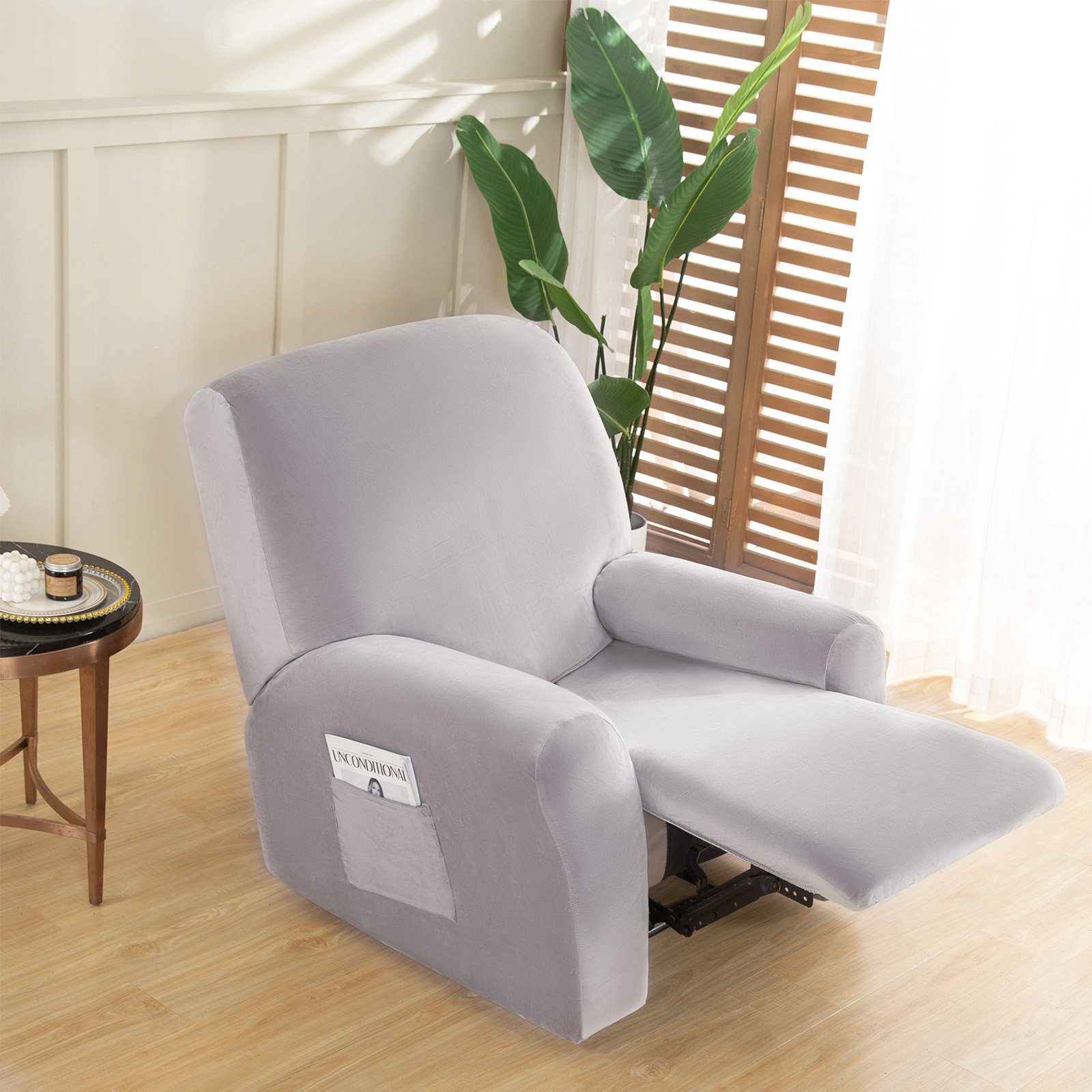Schütze deinen teuren Relaxsessel mit diesem stylischen Bezug! Im 4-teiligen Set: Vorderseite, Rückseite und 2 Armteile. Passt für Sessel mit Rückenbreite 69-100 cm, Höhe 102-127 cm, Sitzbreite 76-102 cm. Aus verdicktem Polyester + Spandex - super dehnbar und bequem! Mit praktischen Seitentaschen für Fernbedienung, Zeitschriften etc. Robuste elastische Bänder für rutschfesten Sitz und vollständigen Schutz. Schützt vor Flecken, Kratzern, Haaren und Tierhaaren. Leopardenmuster verleiht deinem Wohnzimmer einen modernen Look. Einfach zu montieren und abnehmbar. Maschinenwaschbar bei 30°C - pflegeleicht und hygienisch. Verwandelt deinen alten Sessel in ein neues Möbelstück! Einfach überziehen, festziehen und genießen!