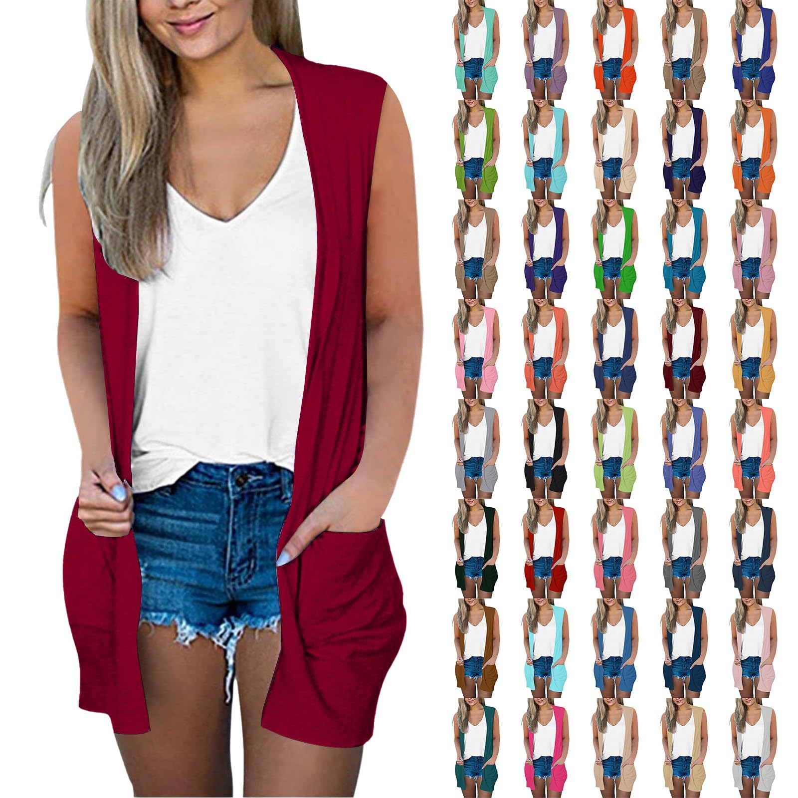 Strickweste Damen Ärmellos - Leichte Sommer Weste Rot Mit Taschen