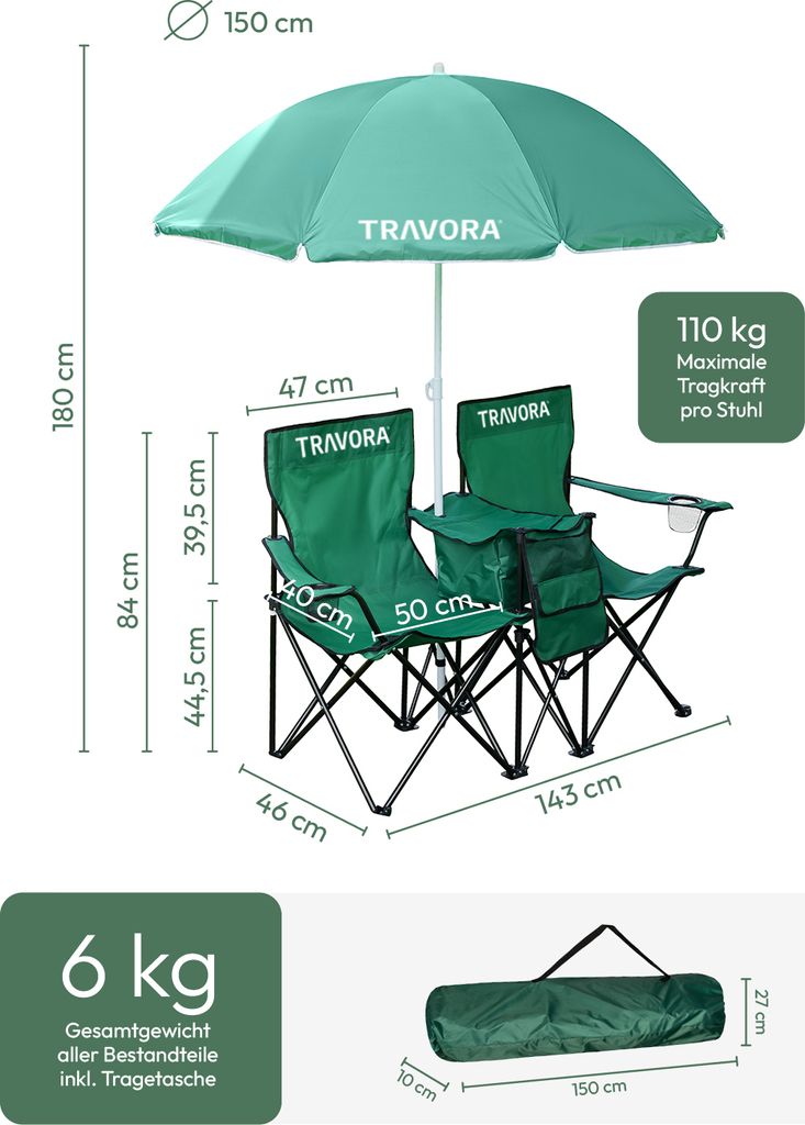 TRAVORA Partner Camping Stuhl 2er Set - Mit Sonnenschirm & Kühlfach, Doppelsitzer Faltbar