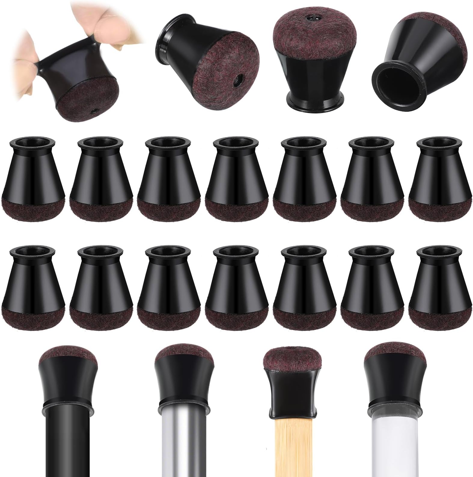 Schluss mit Kratzern und lauten Stuhlgeräuschen! Diese 24 Stuhlbeinkappen aus Silikon mit Filzunterlage schützen deine Böden perfekt. Für runde Stuhlbeine von 15-20mm Durchmesser geeignet - einfach vor dem Kauf nachmessen! Das 360°-Design umschließt die Stuhlbeine komplett und sitzt fest. Die Filzunterseite ermöglicht ein leichtes Gleiten und reduziert Geräusche beim Verschieben. Aus TPE-Material gefertigt, sind sie elastisch und langlebig. In dezentem Schwarz passen sie zu allen Möbeln. Super für Küchenstühle, Esszimmerstühle, Barhocker und mehr. Einfach aufstecken und schon sind deine Holzböden, Fliesen oder Teppiche vor Kratzern geschützt!