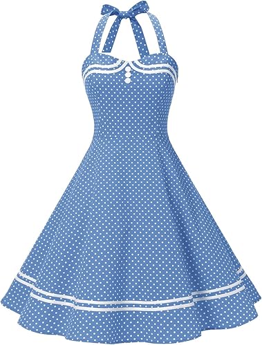 Time Travel in die 50er! Dieses wunderschöne Retro-Kleid im Rockabilly-Style macht jede Party zum Event. Mit süßen Polka Dots, neckholder Trägern und praktischem Gürtel, der deine Taille betont.