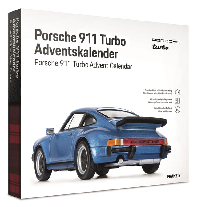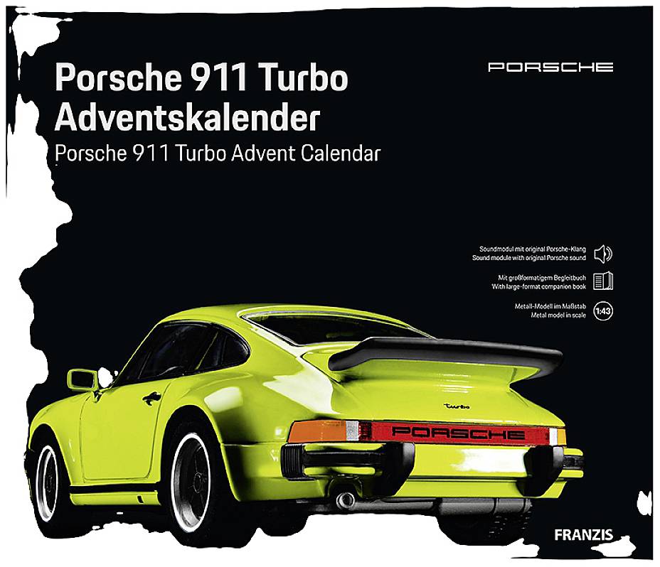 Der ultimative Adventskalender für Porsche-Fans! In 24 Schritten baust du dir einen legendären Porsche 911 im Surfbrett-Design in Bahamagelb zusammen. Der 6-teilige Bausatz hat eine Metallkarosserie zum Stecken und Schrauben - ganz ohne Kleben. Das coole Soundmodul mit Original-Motorsound lässt deinen Porsche auf Knopfdruck lebendig werden! Mit wertigem Begleitbuch in Zusammenarbeit mit dem Porsche Museum. Jede der 24 Wendeboxen hat auf Vorder- und Rückseite ein tolles Motiv und kleine Überraschungen. Am Ende hast du ein ca. 20x15x10cm großes Modell mit Basis und Diorama. So macht Warten auf Weihnachten Spaß!