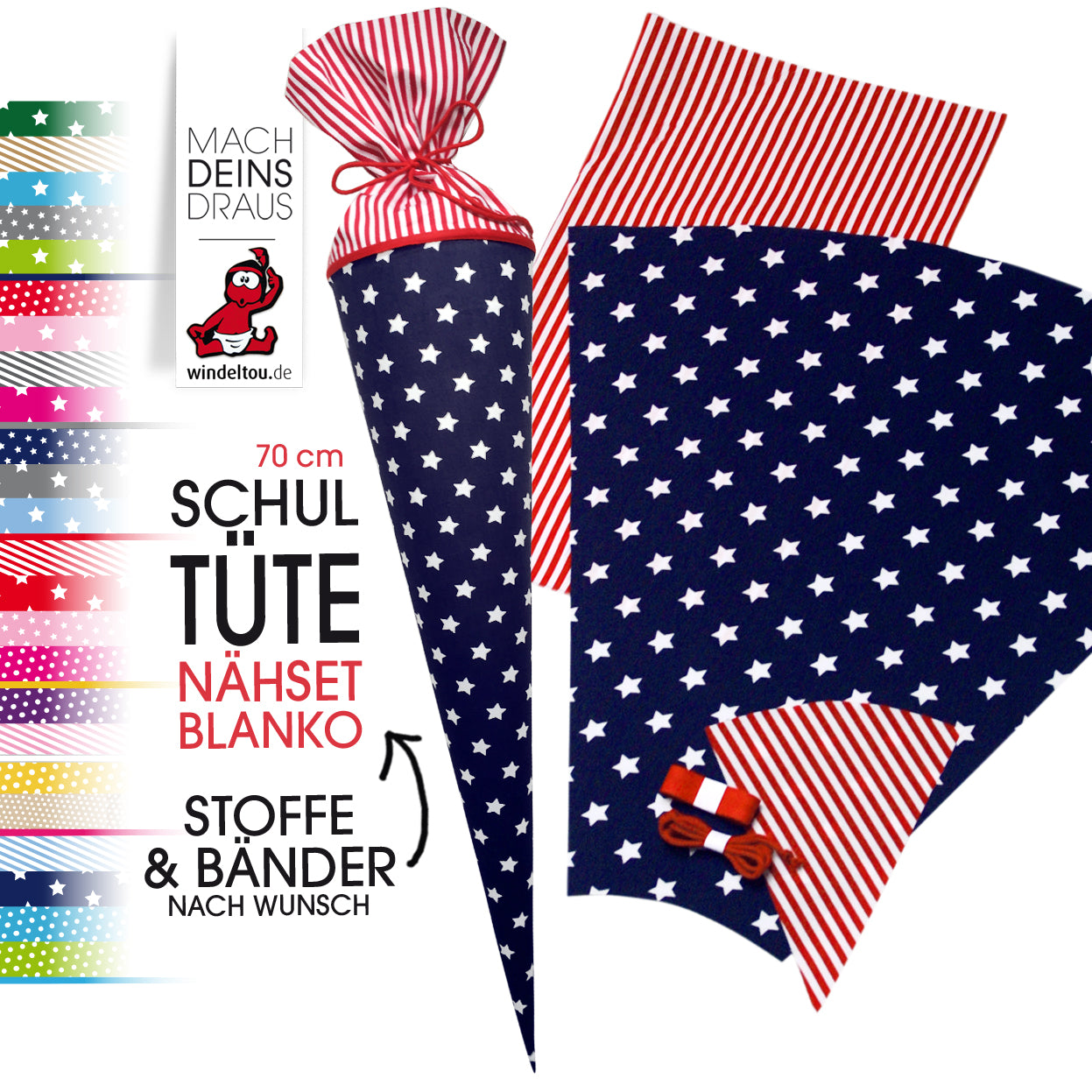 Der erste Schultag steht bevor? Dann wird es Zeit für eine ganz besondere Schultüte! Mit diesem Nähset kannst du eine individuelle Tüte basteln, die es kein zweites Mal gibt.