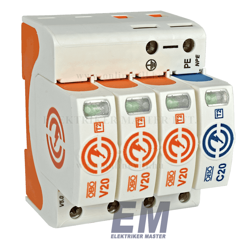 Technische Daten: 275V AC, 20kA Entladestrom, 40kA Maximalstrom, 1,5kV Restspannung. Für Kabel von 10-25mm² (fest) oder 10-16mm² (flexibel).