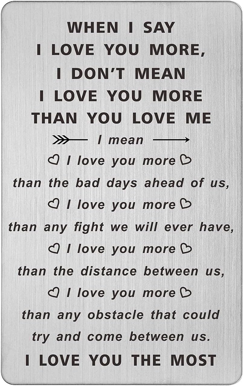 Oh, wie süß! Diese Liebeskarte von TANWIH ist das perfekte Geschenk für deinen Liebsten. Aus hochwertigem Edelstahl mit einer berührenden Botschaft: 'When I say I love you more...' - einfach wunderschön! Mit Kreditkartengröße (8,6x5,4cm) passt sie perfekt in jede Brieftasche. Die Lasergravur ist permanent und verblasst nie. Kommt in einem hübschen Papierumschlag - direkt verschenkfertig! Perfekt für Jahrestage, Valentinstag, Geburtstage oder einfach mal so. Ob für Ehemann, Freund oder Fernbeziehung - diese Karte zeigt, wie sehr du jemanden liebst. Ein kleines Geschenk mit großer Wirkung, das immer bei ihm ist!