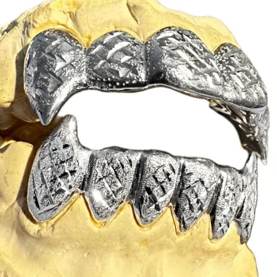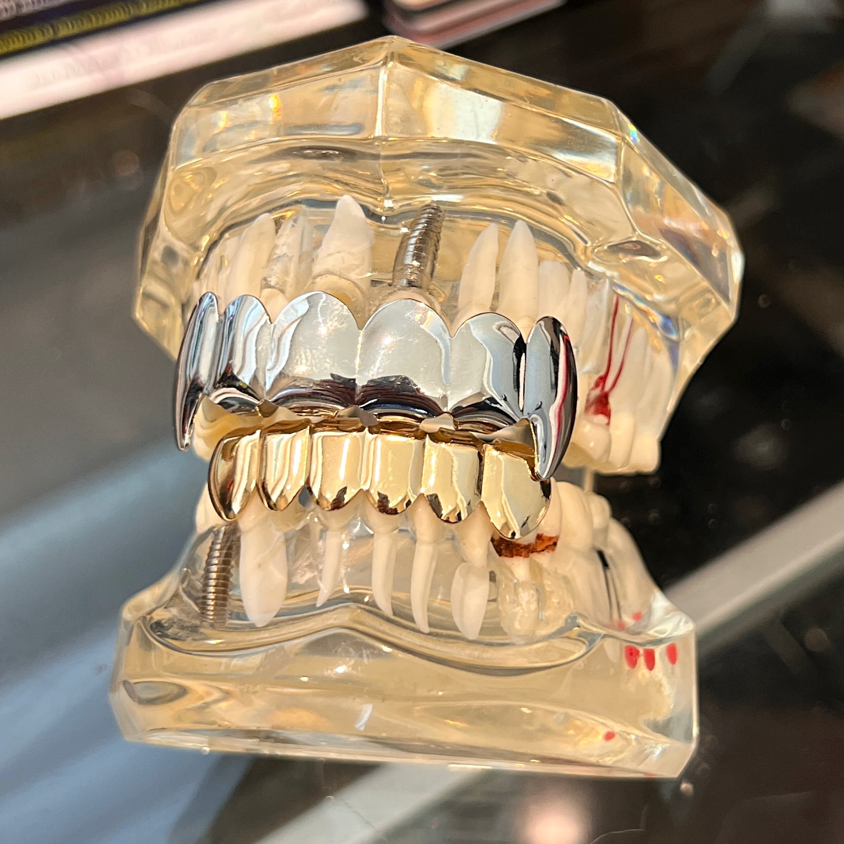 Willst du deinem Lächeln etwas extra Bling verleihen? Der DRACULA TOP Grillz ist genau das Richtige für dich! Ohne lästigen Zahnabdruck - dieser Grill passt auf fast jedes Gebiss! ✨ Mit funkelnden Zirkonia-Steinen besetzt und in Silber-Optik - das zieht definitely Blicke auf sich! Die Silikon-Schicht innen macht das Tragen angenehm und sorgt für guten Sitz. Wichtig: Dies ist reiner Schmuck - nicht zum Essen, Schlafen oder Sport tragen! Auch nicht als Zahnspangen-Ersatz geeignet. Einfach mit heißem Wasser anpassen (Anleitung included) und dann kurz tragen für den perfekten Look. Lieferung inklusive stylischer Box, Silikon für die Anpassung und natürlich der Gebrauchsanweisung. Perfekt für Partys, Konzerte oder wenn du einfach mal etwas ausprobieren willst! Aber remember: Immer nur kurz tragen und bei Schmerzen sofort abnehmen. Nach dem Tragen einfach mit klarem Wasser abspülen und trocken lagern - keine chemischen Reiniger! Ein echter Hingucker der dein Outfit komplett macht. Ob fürs nächste Festival oder einfach nur für coole Fotos - mit diesem Grillz wirst du definitiv auffallen! Just for fun - und immer mit Style!