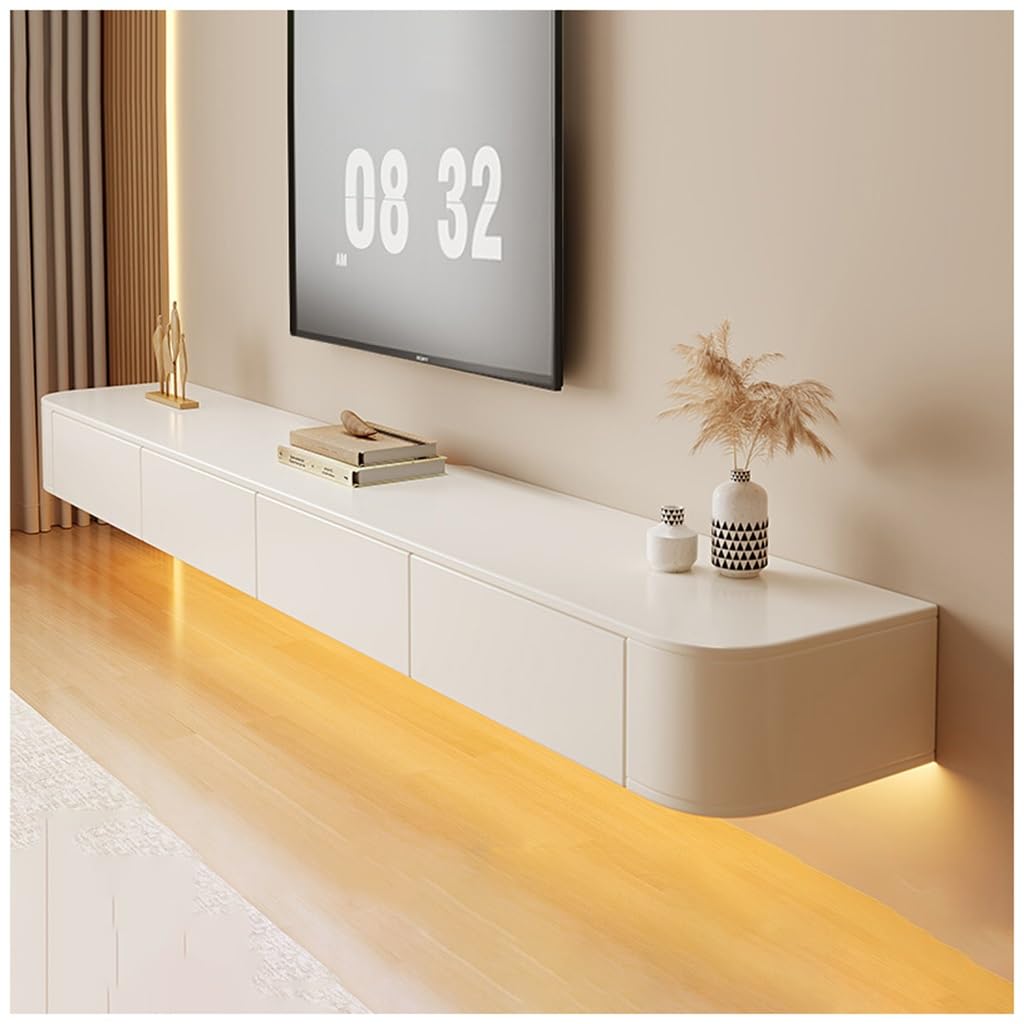 Dieser schwebende TV-Schrank ist einfach genial! In Weiß, 160cm breit, 24cm tief und 20cm hoch. Mit 2 Schubladen und 2 Klappen bietet er reichlich Stauraum für alle Fernbedienungen, Konsolen und Zubehör. Das besondere Design: er hängt an der Wand und schwebt quasi über dem Boden - sieht super modern aus und macht das Putzen darunter zum Kinderspiel. Mit integriertem Kabelmanagement - alle Kabel verschwinden ordentlich in der ausgehöhlten Rückseite. Aus massivem Holz, stabil und langlebig. Die abgerundeten Ecken sind besonders familienfreundlich. Einfache Montage - alles dabei! Perfekt fürs Wohnzimmer, aber auch für Schlafzimmer oder Esszimmer geeignet. Macht jeden Raum sofort aufgeräumter und stylischer!