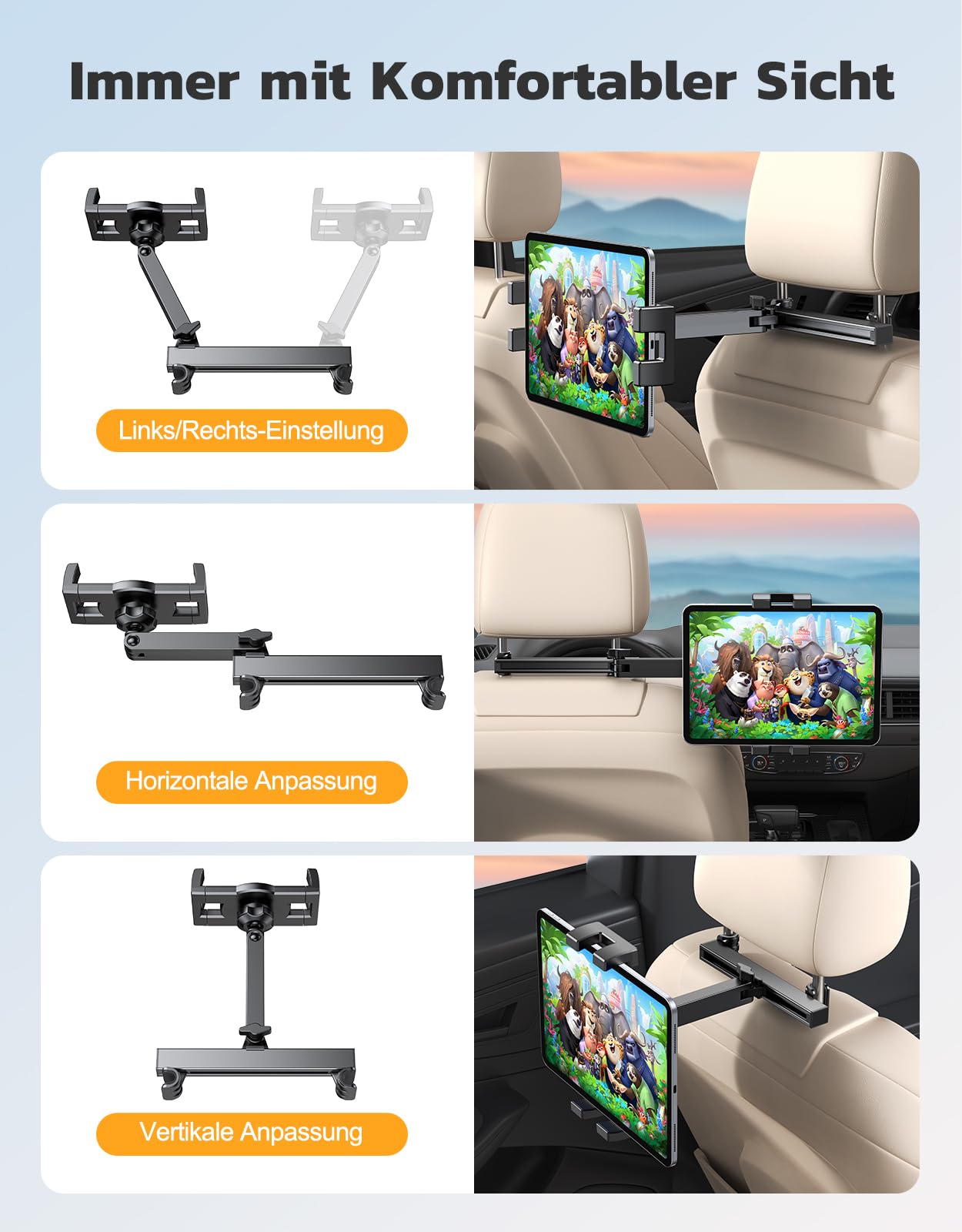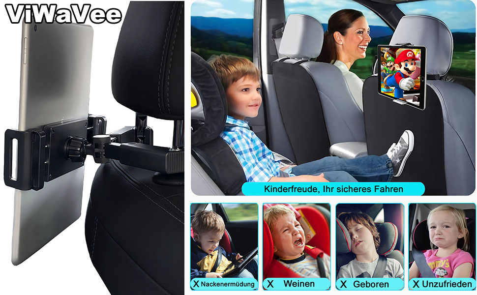 Lange Autofahrten mit Kindern? Oder einfach nur Navigation und Entertainment für Beifahrer? 🚗 Diese Tablet-Halterung macht jede Fahrt entspannter!\n\nKompatibel mit so gut wie allen Geräten:\n• iPads aller Art\n• Samsung Tablets\n• Smartphones von 4,7 bis 13 Zoll\n• E-Reader und kleine Laptops\n\nWarum sie so praktisch ist:\n✔️ Einfache Montage: Schnell an der Kopfstütze befestigt\n✔️ 360° drehbar: Perfekter Blickwinkel für jeden Passagier\n✔️ Ausziehbar: Von 6 cm bis 27 cm - passt sich jedem Gerät an\n✔️ Stabil: Aluminium-Gestell hält auch auf holprigen Straßen\n✔️ Platzsparend: Klappt zusammen wenn nicht gebraucht\n\nBesondere Features:\n• Verdickte Silikon-Polster: Schützen dein Gerät vor Kratzern\n• Sicherheitsmechanismus: Hält das Tablet bombenfest\n• Passend für Kopfstützen von 94-160 mm Dicke\n• Leichtes Material: Macht nicht die Kopfstütze schwer\n\nEinsatzmöglichkeiten:\n• Filme schauen auf langen Fahrten\n• Navigation für Beifahrer\n• Videotelefonate während der Fahrt\n• Entertainment für Kinder auf der Rückbank\n• Geschäfts-Präsentationen im Auto\n\nEinfach das bewegliche Ende an der Kopfstütze befestigen, Sicherheitsmechanismus verriegeln und das Tablet einklicken - fertig! Kein Wackeln, kein Verrutschen, nur Entertainment pur. 🎬\n\nOb Familienurlaub, Geschäftsreise oder täglicher Pendelweg - diese Halterung ist dein bester Reisebegleiter. Endlich keine Diskussionen mehr über 'wer darf das Tablet halten'! 😊