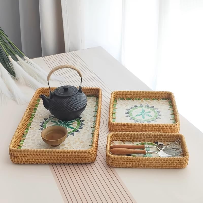 Bringe Boho-Flair in dein Zuhause! Dieses 3-teilige Rattan Tablett Set mit wunderschönem Muschel-Mosaik ist ein echter Hingucker. Hergestellt aus natürlichem Rattan und Perlmutt-Elementen, behält jedes Tablett seine einzigartige Textur - kein Stück gleicht dem anderen! Die drei Größen (S: 20x10cm, M: 20x20cm, L: 37x23cm) sind perfekt aufeinander abgestimmt. Ob fürs Frühstück im Bett, als Obsttablett in der Küche oder als Deko auf dem Couchtisch - diese Tabletts sind wahre Alleskönner. Besonders praktisch: Sie sind hitze- und feuchtigkeitsbeständig, sodass du auch heiße Tassen oder kalte Getränke bedenkenlos daraufstellen kannst. Die Reinigung ist denkbar einfach - einfach mit einem feuchten Tuch abwischen. Allerdings nicht für die Spülmaschine geeignet! Durch das handgefertigte Design hat jedes Tablett seine kleinen Unikats-Merkmale - das macht den Charme dieses Sets aus. Perfekt für alle, die ihrem Zuhause eine persönliche Note verleihen wollen. Ob alleine oder als Geschenk - diese Tabletts verzaubern jeden Raum mit ihrem natürlichen, zeitlosen Design!