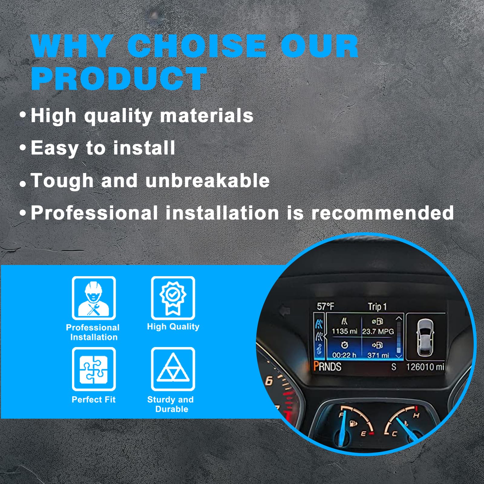 Dein Tacho zeigt nichts mehr? Dieses LCD Display ist die Lösung! Passgenau für Ford Focus und Escape 2013-2016 mit 150 MPH Tachometer. 10,7 cm großer Farbbildschirm mit 480x272 Pixel Auflösung - gestochen scharf und klar. Einfacher Einbau als Direkttausch für dein Originaldisplay. Wichtig: Nur für Profis zum Einbauen, wir liefern ohne Anleitung. Die Schutzfolie vor Gebrauch entfernen. So siehst du wieder alle wichtigen Fahrinformationen auf einen Blick!
