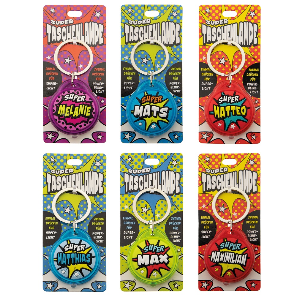 Kleine Superhelden aufgepasst! Diese coole Taschenlampe im Comic-Design begeistert jedes Kind. Perfekt personalisierbar mit Namen oder Titeln wie 'Sohn', 'Opa' oder 'Superstar'. Super helles Licht für alle Abenteuer. Mit praktischem Anhänger für Schultasche oder Federmäppchen. In fünf knalligen Farbkombinationen erhältlich. Das ideale Geschenk für Geburtstage, Weihnachten oder die Einschulung. Über 60 männliche und 70 weibliche Namen zur Auswahl! Dein Kind wird strahlen wie die Taschenlampe selbst. Einfach Namen wählen und das perfekte persönliche Geschenk erhalten. Mach deinem kleinen Helden eine riesige Freude!