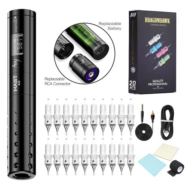 Tattoo Machine Complete Set - Rotary Pen 4.0mm Stroke Mit 20 Nadeln & 10 Farben