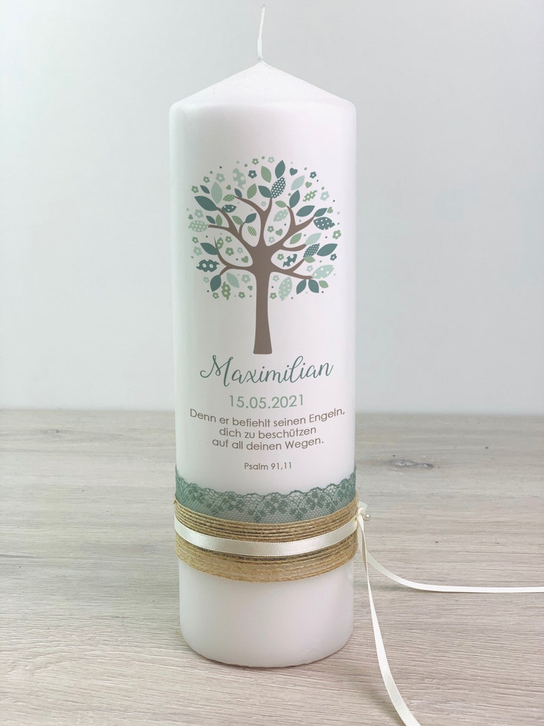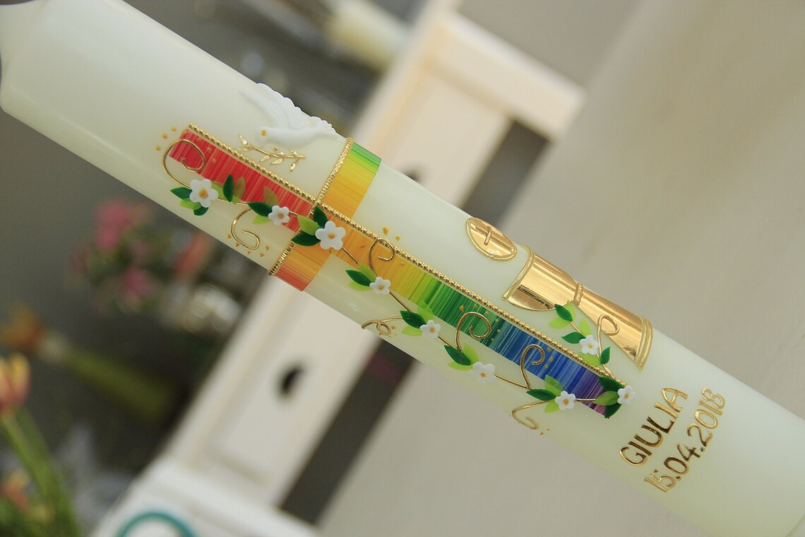 Eine wunderschöne handgefertigte Taufkerze, die später auch als Kommunionkerze verwendet werden kann! Mit edlem christlichen Wachsmotiv in Silber und geschwungenem Kreuz. Die Kerze ist ca. 40cm lang bei 3,5cm Durchmesser - ein richtiger Hingucker. Im Set inklusive: Exakt passender Kerzenhalter aus recyclingfähigem PETG, damit die Kerze während der ganzen Feier sicher steht. Plus Aufkleber für individuelle Beschriftung mit Zahlen und Buchstaben. Wichtig: Immer in einem Kerzenhalter verwenden und auf feuerfester Unterlage platzieren. Nie unbeaufsichtigt brennen lassen! Entsorgen, wenn sie bis zur Markierung abgebrannt ist. Ein zeitloses Stück für den besonderen Tag, das noch lange in Erinnerung bleibt.