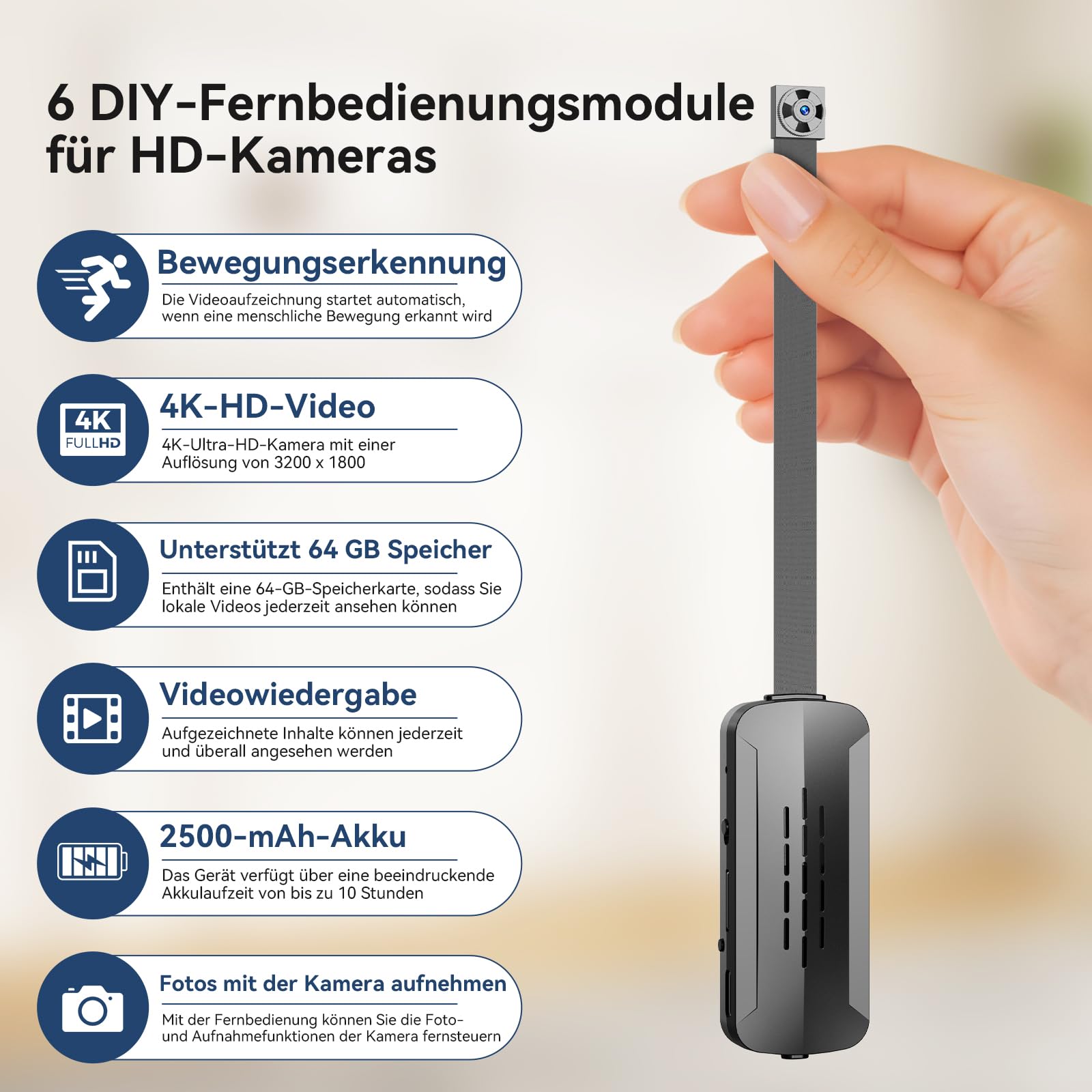 Hey, diese Mini-Kamera ist perfekt für deine Sicherheit! Sie filmt in ultra-scharfer 4K-Qualität und erkennt jede Bewegung. Das beste: Sie läuft mit Akku - kein Kabelsalat! Einfach die mitgelieferte 64GB SD-Karte reinstecken und schon zeichnet sie automatisch alles auf. Wenn der Speicher voll ist, überschreibt sie die ältesten Aufnahmen, also musst du dich um nichts kümmern. Der Akku hält bis zu 8 Stunden - ideal für längere Überwachung. Per Fernbedienung kannst du starten und stoppen, ohne in die Nähe der Kamera zu müssen. Perfekt für Zuhause, im Garten oder wenn du mal verreist bist. Wichtig: Bitte nur legal verwenden! Einfach aufladen, positionieren und dich sicher fühlen. Die Kamera ist so klein und unauffällig, dass sie kaum jemand bemerkt. Dein persönlicher Wachdienst für jeden Einsatz!