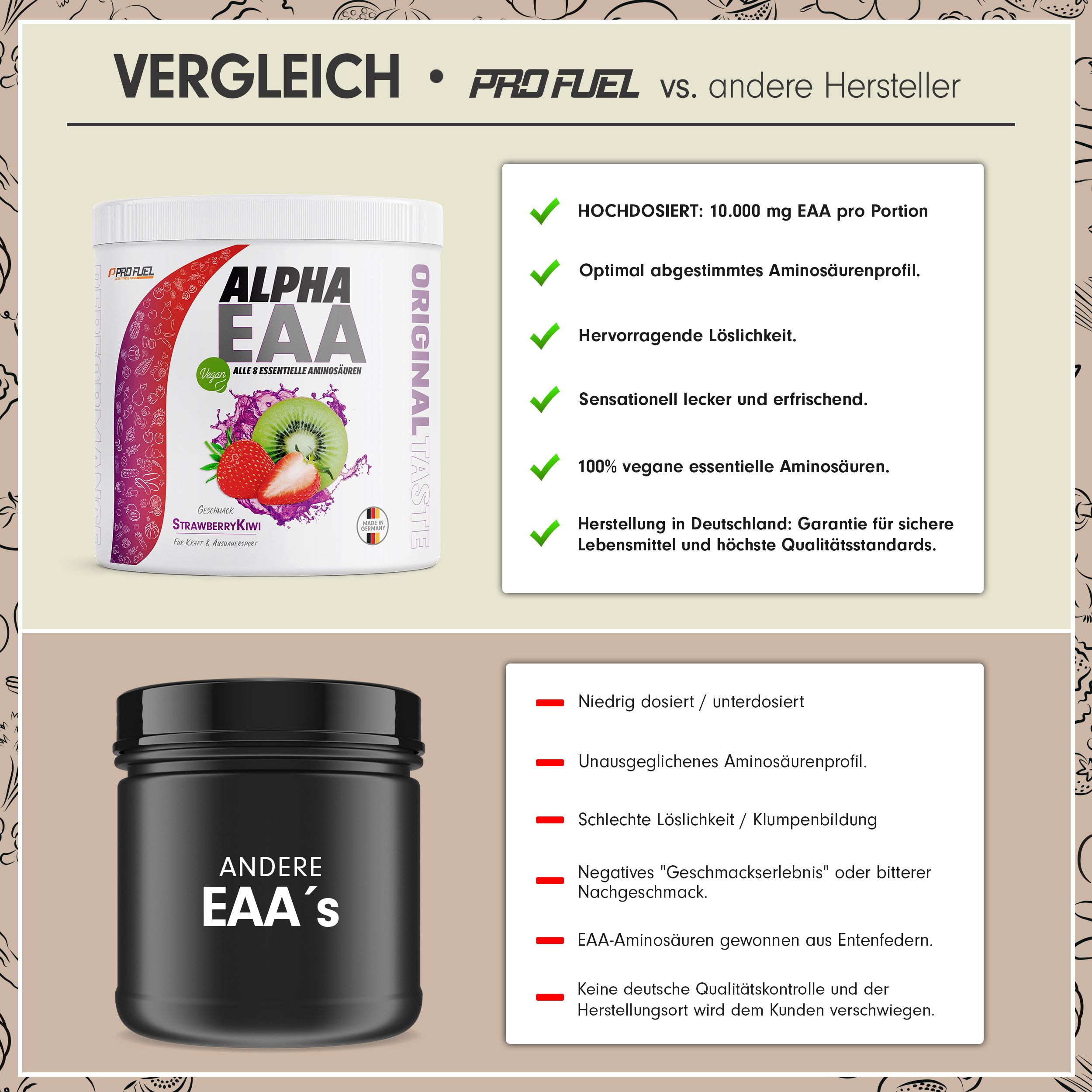 Dieses Neosupps EAA Pulver ist der Game-Changer für dein Training! Mit stolzen 10.300 mg essentiellen Aminosäuren pro Portion unterstützt es deine Muskeln optimal beim Aufbau und bei der Regeneration. Der erfrischende Pfirsich-Eistee-Geschmack ohne Zuckerzusatz macht das Trinken zum Vergnügen. Perfekt für vor oder während des Trainings - es steigert deine Leistung, reduziert Ermüdung und fördert eine schnellere Erholung. Die spezielle Formel unterstützt die Proteinsynthese und hilft, Muskelabbau zu verhindern. Ob Kraftsport, Ausdauertraining oder Fitness - dieses Pulver liefert deinen Muskeln, was sie brauchen. Hergestellt in Deutschland, leicht löslich und ideal für eine bewusste Ernährung. Einfach mixen und profitieren! Du wirst den Unterschied spüren - mehr Power, bessere Regeneration und sichtbare Erfolge. Für alle, die ihre Fitness-Ziele ernst nehmen und ihren Körper optimal unterstützen wollen.