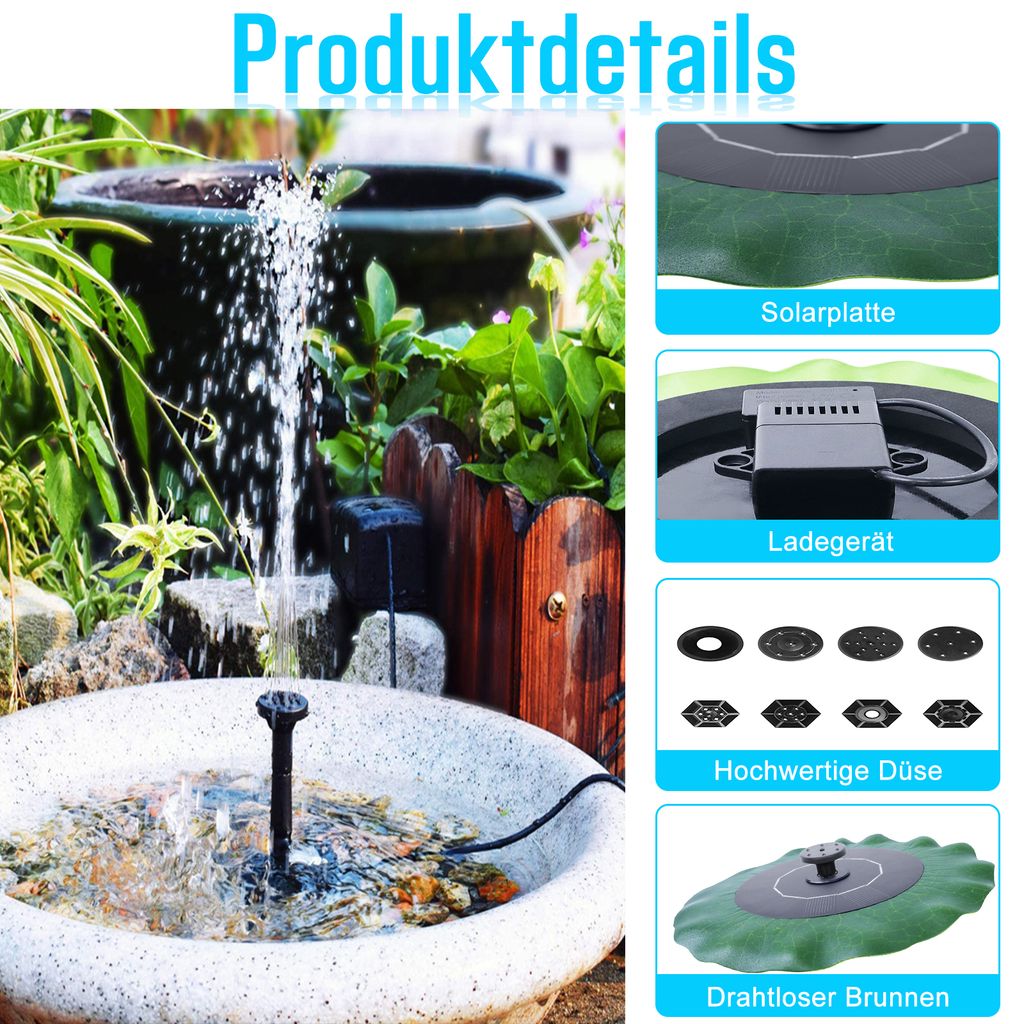 Hey, stell dir vor: Dein Gartenteich wird zum absoluten Hingucker - ganz ohne Stromkabel und komplizierte Installation! Die LARS360 Solar Teichpumpe macht's möglich. Sobald die Sonne scheint, springt sie sofort an und zaubert tolle Wasserspiele in deinen Garten. \n\nDas Beste? Du brauchst nur Sonnenlicht - keine Batterien, kein Stromkabel, null Kosten für Energie! Mit den 4 verschiedenen Düsen kannst du dir aussuchen, wie das Wasser sprudeln soll. Mal fein perlend, mal als hoher Strahl - je nach Lust und Laune. \n\nTechnische Facts für dich:\n• Solarmodul: 7V/1,8W im praktischen Quadrat-Format (11x11cm)\n• Maximale Förderleistung: Bis zu 180 Liter pro Stunde\n• Bürstenloser Motor - super langlebig und sparsam\n• Automatischer Stopp, wenn die Pumpe aus dem Wasser genommen wird\n\nPerfekt für kleine Teiche, Vogeltränken oder dein Aquarium. Aber Achtung: Bei Wolken oder Schatten macht sie natürlich Pause - schließlich braucht sie die Sonne als Antrieb. \n\nEinfach die Pumpe ins Wasser stellen, Solarpanel in die Sonne legen und schon geht's los! Je stärker die Sonne scheint, desto höher steigt der Wasserstrahl. Vergiss nur nicht, die Schutzfolie vom Panel zu entfernen - sonst gibt's keine Power.\n\nÜbrigens: Die Pumpe hat keinen Akku, also wirklich nur bei Sonne im Einsatz. Perfect für alle, die ihren Garten umweltfreundlich verschönern wollen!