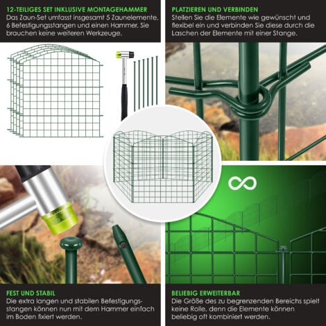 Sicherheit für deinen Teich oder Pool! Dieses Komplett-Set mit 5 Zaunelementen aus Metall ist schnell aufgebaut und flexibel einsetzbar. Einfach die Pfosten mit dem Gummihammer in den Boden treten und die Elemente einstecken - fertig! Das Stecksystem ermöglicht gerade Linien, Kurven oder sogar Kreise. Das witterungsbeständige Metall rostet nicht und hält Jahre lang. Kann mit weiteren Elementen beliebig verlängert werden. Perfekter Schutz für Kinder und Haustiere - gibt dir ein sicheres Gefühl im Garten. Auch als Abgrenzung für Beete oder als dekorative Gartengestaltung geeignet.