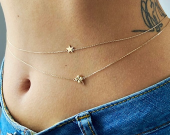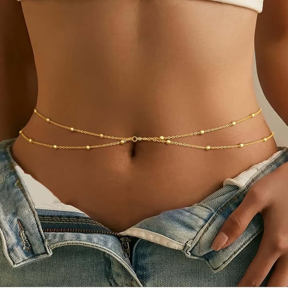 Sommerfeeling für deine Taille! Dieses stylische Bauchketten-Set mit 5 goldenen Ketten verleiht jedem Outfit einen Hauch von Glamour. Enthalten sind 4 einfache Ketten (95cm) und 1 doppelte Kette (90cm) - perfekt zum Kombinieren und Layern. Die feinen goldenen Ketten liegen angenehm auf der Haut und betonen deine Taille auf elegante Weise. Super für den Strand, Partys oder einfach für den Alltag - ob über Bikinis, Kleidern oder Röcken. Die Längen sind ideal für die meisten Körpergrößen und sorgen für eine perfekte Passform. Einfach anlegen und deinen persönlichen Stil unterstreichen - ob einzeln oder alle zusammen getragen. Die hochwertige Verarbeitung garantiert Langlebigkeit und Komfort. Perfekt als Geschenk für die beste Freundin oder für dich selbst, um deine Sommer-Outfits aufzupeppen. Mit diesen Bauchketten wirst du garantiert zum Hingucker!