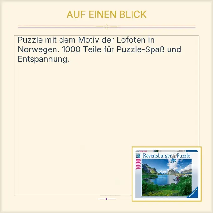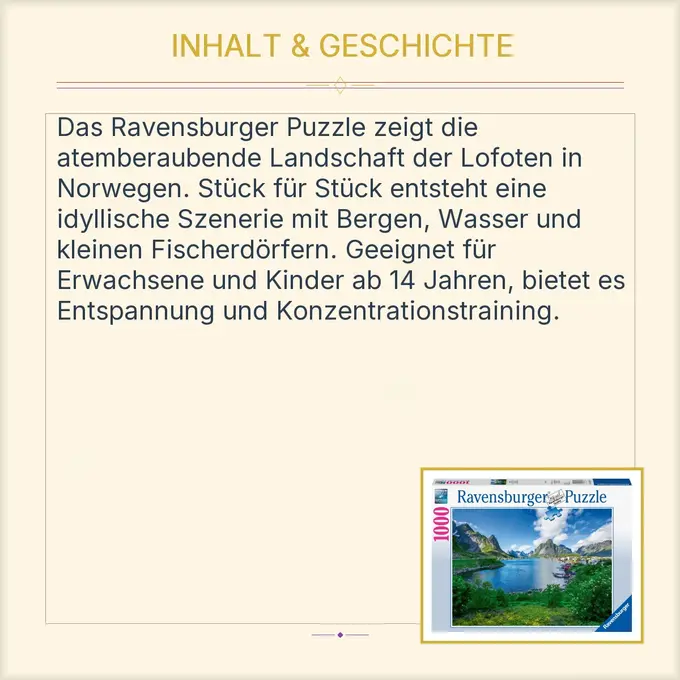 Suchst du nach der perfekten Entspannung nach einem stressigen Tag? Dieses 1000-Teile Puzzle von Ravensburger mit dem atemberaubenden Motiv \Norwegischer Fjord\ ist genau das Richtige! Stück für Stück tauchst du ein in diese wunderschöne Landschaft und vergisst dabei ganz den Alltag. Ravensburger steht für Premium-Qualität: handgefertigte Stanzwerkzeuge sorgen für einzigartige Puzzleteile, die perfekt zusammenpassen. Das Beste? Das Puzzle ist auf nachhaltige Weise produziert - über 80% weniger Plastik, kompaktere Verpackung und mindestens 70% recycelter Karton. Das fertige Bild misst stolze 69,9 x 49,7 cm und ist ohne Überlappungen auf der Schachtel abgebildet. Perfekt für alle ab 14 Jahren, die eine echte Herausforderung suchen. Übrigens: Wenn du das Puzzle fertig hast, kannst du es auch zusammenkleben und als wunderschöne Wanddekoration aufhängen! Ein super Geschenk für Puzzle-Fans oder einfach für dich selbst. Mit der charakteristischen Naturleinenprägung gibt's keine störenden Reflexe und die Teile sind schön knickstabil. Puzzle-Spaß pur!