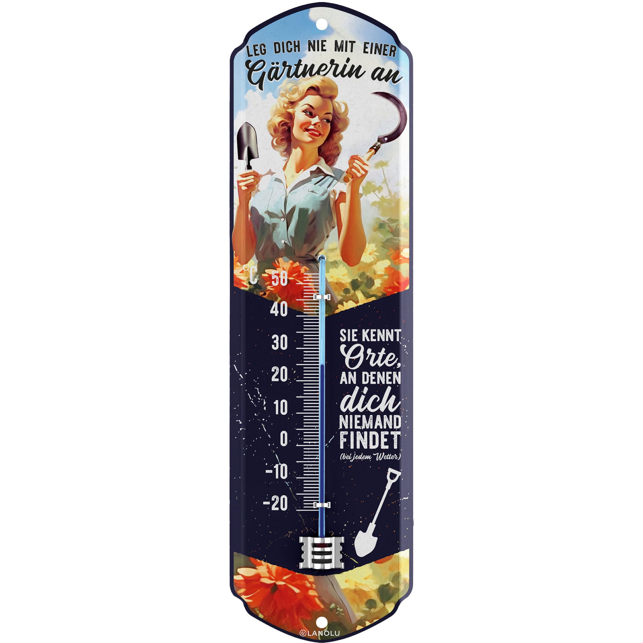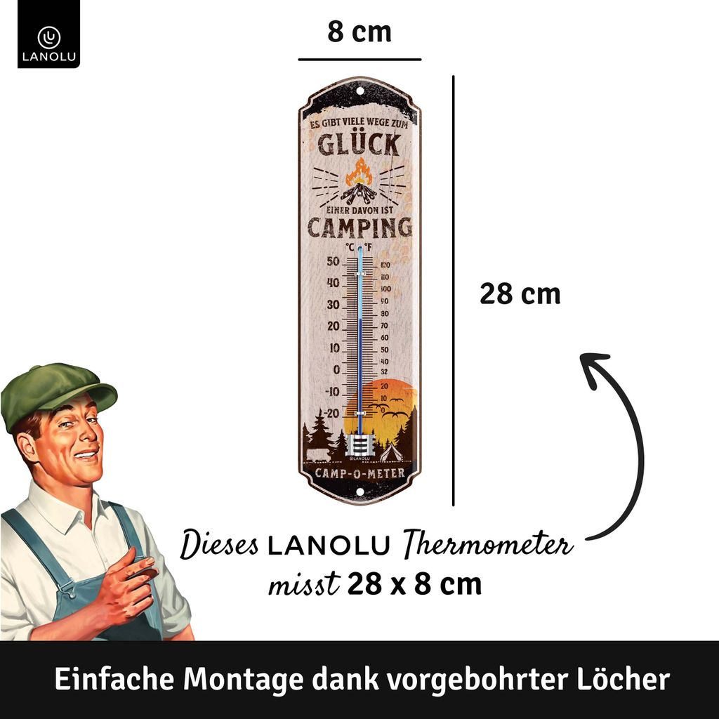Dieses LANOLU Thermometer ist einfach mega stylisch! Im Vintage-Design mit dem Spruch 'Wohlfühl-Oase' - passt perfekt in Garten, Balkon oder Terrasse. Mit 8x28cm Größe ist es genau richtig um Aufmerksamkeit zu erregen ohne aufdringlich zu sein. Aus stabilem Stahlblech gefertigt - absolut wetterfest und hält auch mal was aus. Die zwei vorgebohrten Löcher machen die Montage super einfach. Einfach an die Wand schrauben oder mit Draht aufhängen. Das scharfe Druckbild in strahlenden Farben bleibt auch nach Jahren noch schön. Perfekt als Geschenk - kommt immer gut an! Designed in Berlin - da weiß man was man hat. Ob im Garten, auf dem Balkon oder an der Hauswand - dieses Thermometer macht einfach immer was her!