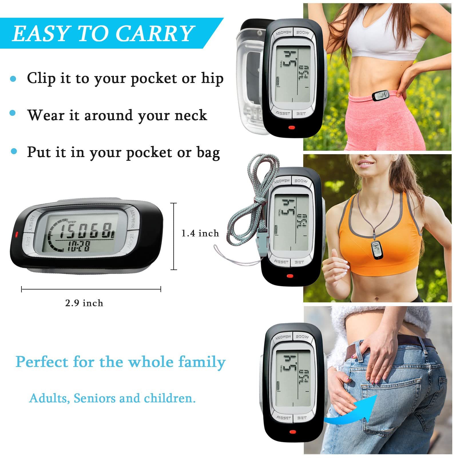 Bleib in Bewegung mit diesem praktischen Schrittzähler! Der 3D-Sensor zählt deine Schritte super genau - egal ob in der Tasche, am Gürtel oder um den Hals. Bis zu 99.999 Schritte speichert das Gerät! Die wiederaufladbare Batterie lädt einfach per USB - kein Batteriewechsel nötig. Mit Clip und Band im Lieferumfang - du kannst ihn tragen wie du willst! Das große LCD-Display ist gut ablesbar, die Hintergrundbeleuchtung hilft bei Dunkelheit. Nur eine Taste für alles - kurzer Druck für Licht, langer Druck zum Zurücksetzen. Ohne Bluetooth, ohne komplizierte Einstellungen - einfach loslaufen und zählen lassen! Perfekt für Frauen, Männer, Kinder und Senioren. Leicht (nur 38g) und klein (7,5cm) - kaum spürbar in der Tasche. Ein toller Motivator für deine täglichen Fitnessziele! Einfach, aber effektiv - so sollte ein Schrittzähler sein!