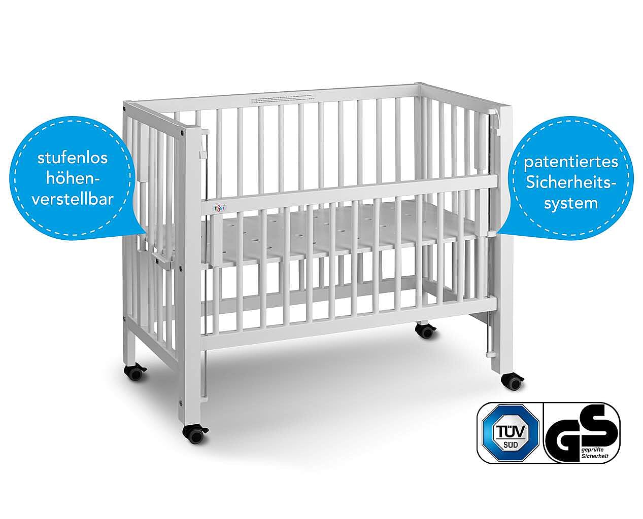 Das vielseitigste Babybett ever! Der tiSsi HAJO in Buche weiß ist Beistellbett, Babybett und Stubenwagen in einem. Aus massivem Buchenholz, super langlebig und mitwachsend bis ca. 6 Jahre. Maße: 124x64cm, Liegefläche 120x60cm. Mit 4 Rollen inklusive Feststellbremse - einfach ans Elternbett schieben und arretieren. Das integrierte Verschlussgitter und die drei Schlupfsprossen sorgen für Sicherheit. Stufenlos höhenverstellbar, perfekt zum Anstellen. Sogar als Wickelplatz nutzbar - praktisch für die Nacht! Ökologisch unbedenklich, ohne belastende Stoffe. Einfach mit feuchtem Tuch abwischen. Ein Begleiter für Jahre - nachhaltig und durchdacht!