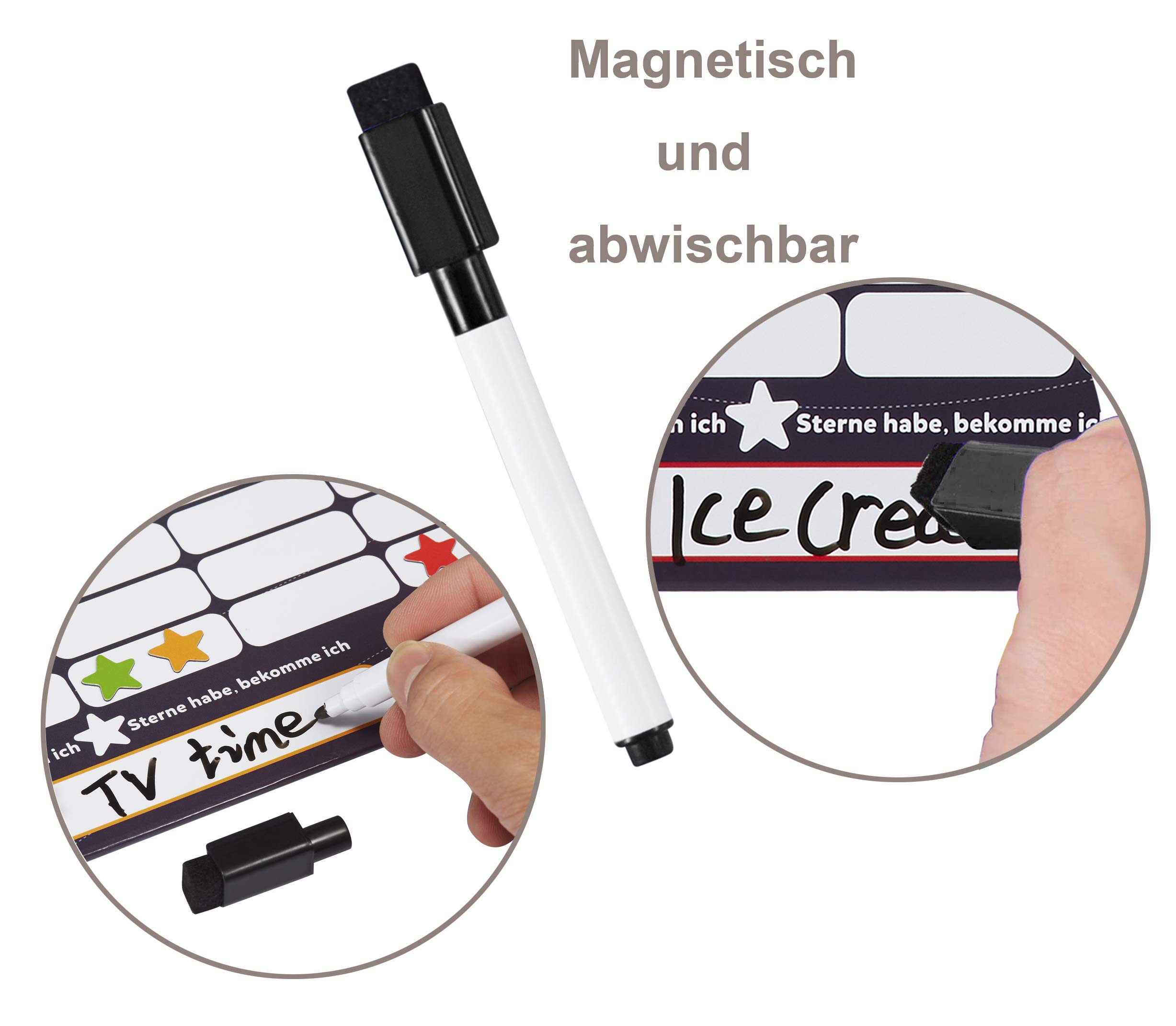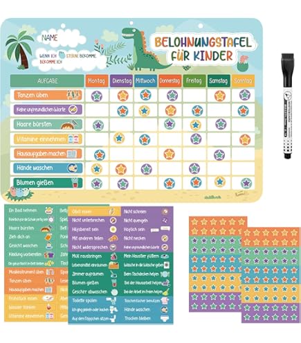 Wow, diese Belohnungstafel ist ja mal richtig süß! In Form eines roten Busses mit 26 niedlichen Tiermagneten - damit macht das Lernen von gutem Verhalten richtig Spaß. Die Tafel ist 28x12 cm groß und hat Platz für den Namen deines Kindes, die Aufgaben und 5 Belohnungsfelder. Super einfach zu benutzen: Einfach an einer Metalloberfläche befestigen und die Tiermagnete als Belohnung verwenden. Aus hochwertigem, wasserdichtem Material mit starken Magneten, die richtig gut halten. Perfekt um Kindern Verantwortung beizubringen und sie für gute Taten zu belohnen. Die bunten Tiere wie Zebra, Elefant und Kaninchen motivieren dein Kind, denn sie wollen ja alle mit im Bus fahren! Einfach eine tolle Möglichkeit, um gemeinsam Ziele zu setzen und Erfolge zu feiern. Ob für zu Hause oder im Kindergarten - diese Tafel bringt Freude ins Lernen!