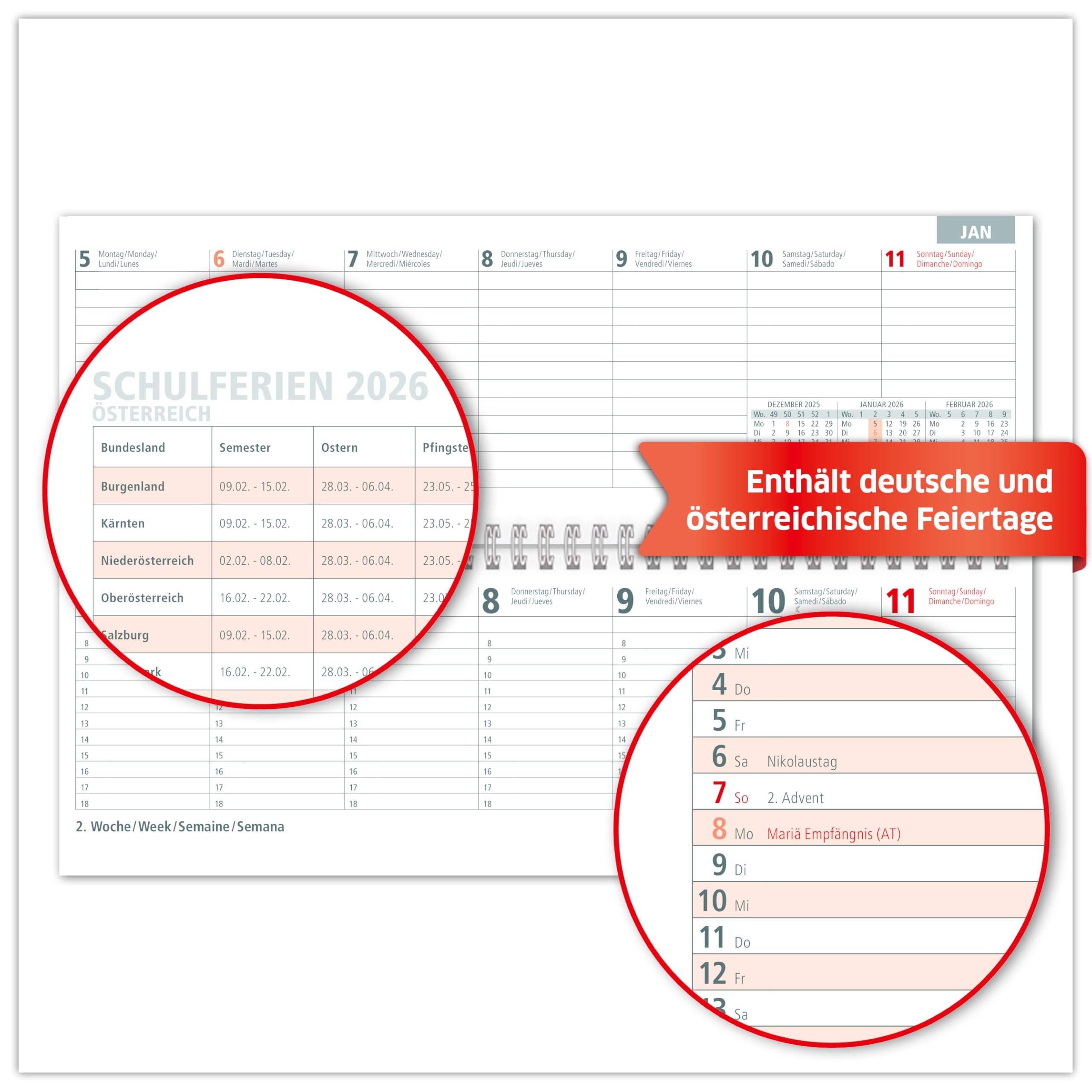 PRIMUS Tischkalender 2026 - Wochenkalender Mit Feiertagen & Schulferien DE/AT