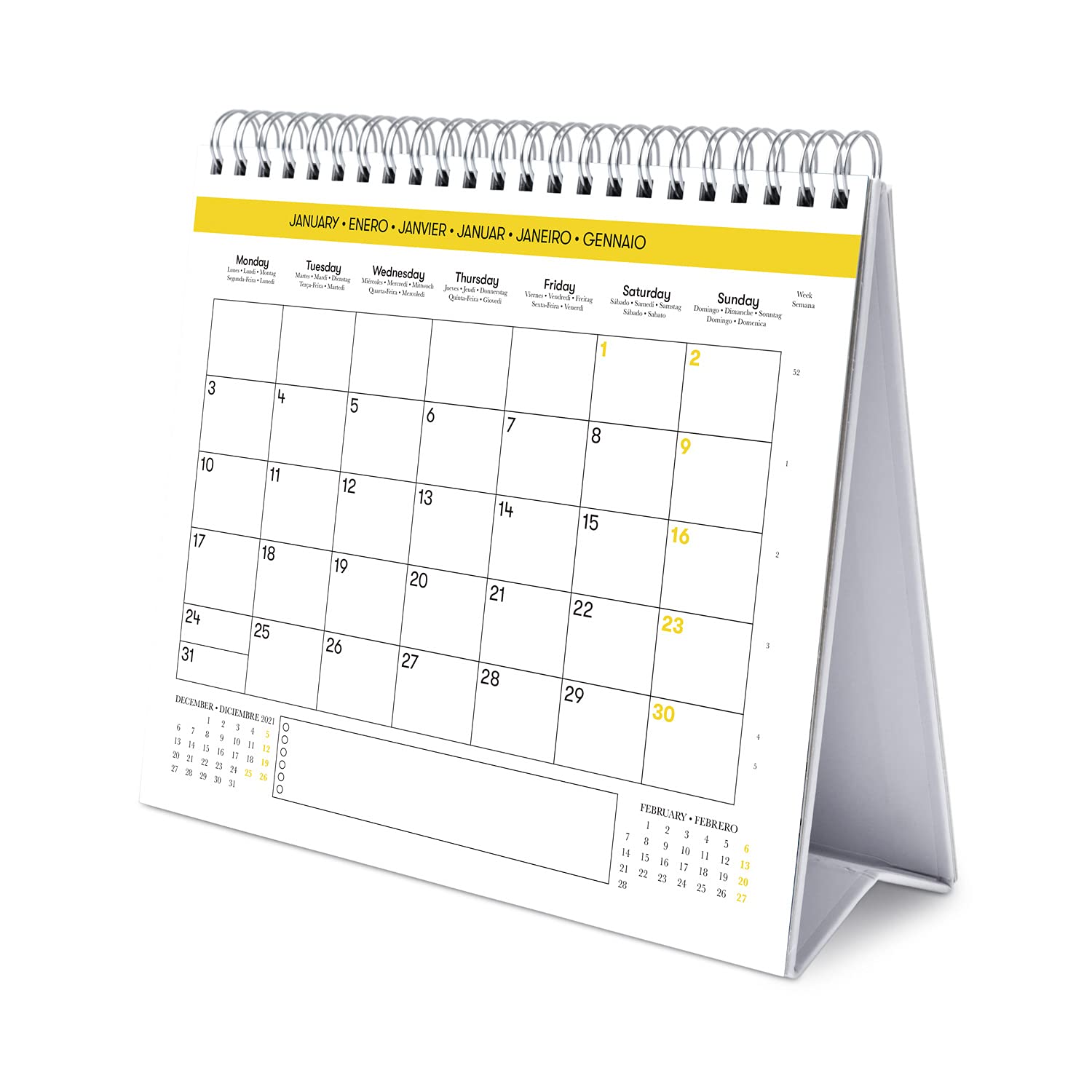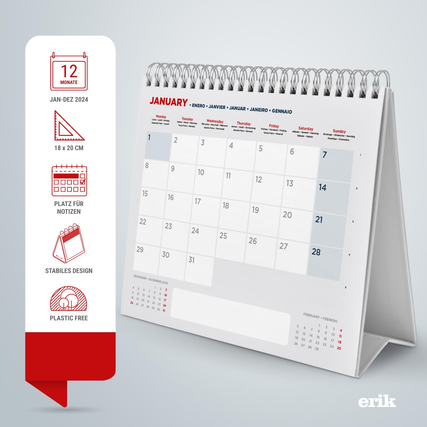 Suchst du einen schönen Kalender für deinen Schreibtisch? Dieser New York Tischkalender von Grupo Erik bringt Großstadt-Flair auf deinen Tisch! Mit 12 wunderschönen New York Motiven - für jeden Monat ein neues Bild, das dich in die Weltmetropole entführt. Maße: 20 x 18 cm, also perfekt für jeden Schreibtisch ohne viel Platz wegzunehmen. Der Kalender zeigt dir die ganze Woche auf einen Blick, super praktisch für deine Terminplanung. Geburtstage, Meetings, wichtige Events - alles hat Platz. Das robuste Gestell mit Spiralbindung steht sicher und das Blättern geht super einfach. Besonders cool: Der Kalender ist sechssprachig (Deutsch, Englisch, Spanisch, Französisch, Portugiesisch, Italienisch) - ideal für internationale Teams oder wenn du einfach mal was auf Französisch lesen willst. Hochwertige Materialien und offizielle Lizenzen garantieren Qualität. Ob fürs Büro oder Zuhause - mit diesem Kalender verpasst du keinen Termin und hast täglich ein bisschen New York-Feeling!