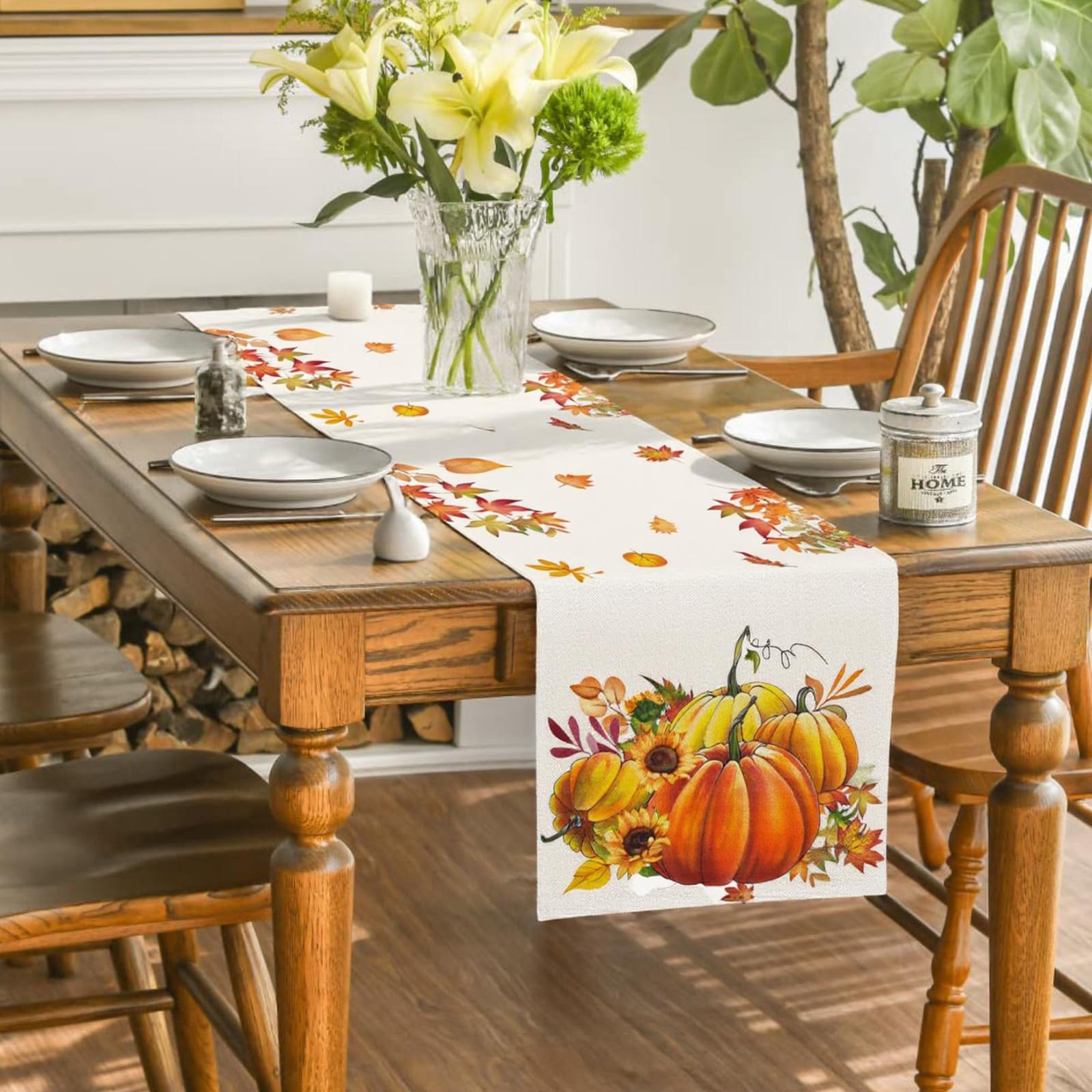 Bring herbstliche Gemütlichkeit an deinen Esstisch! Dieser wunderschöne Tischläufer mit 183x33cm ist perfekt für die gemütliche Jahreszeit. Bedruckt mit niedlichen Kürbissen, sonnigen Sonnenblumen und bunten Ahornblättern sorgt er sofort für Herbststimmung. Aus weichem Leinenstoff fühlt er sich nicht nur gut an, sondern schützt auch deine Tischoberfläche vor heißen Töpfen, Kratzern und Flecken. Perfekt für Erntedankfeste, Thanksgiving, Herbstpartys oder einfach für die tägliche Deko zu Hause. Und wenn er mal schmutzig wird - kein Problem! Einfach bei 30 Grad in die Waschmaschine und er sieht wieder aus wie neu. Mach dein Zuhause mit diesem Läufer noch gemütlicher und genieße die besondere Atmosphäre des Herbstes!