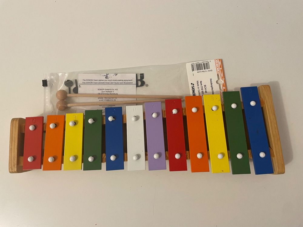 Das perfekte erste Musikinstrument für dein Kind! Das Bino Xylophon mit 12 Tönen - nicht überfordernd, aber anregend. Aus massivem Holz - super robust und langlebig. Mit bunten Klangplatten in Regenbogenfarben - sieht fröhlich aus! Inklusive 2 Schlägeln - damit kann sofort losgelegt werden. Maße: 33x22x4cm - perfekte Größe für kleine Hände. Trainiert das Gehör und Rhythmusgefühl - spielerisch lernen! Fördert die Hand-Augen-Koordination - wichtig für die Entwicklung. EU-zertifiziert und sicher - alles geprüft nach Standards. Perfekt für Kinder ab 3 Jahren - aber auch jüngere Geschwister haben Spaß! Macht schöne, harmonische Töne - keine schrillen Geräusche. Ideal für zuhause, Kindergarten oder Musikschule. Einfach ein zeitloses Spielzeug das Generationen überdauert! Dein Kind wird stundenlang Spaß damit haben - und dabei noch was lernen!