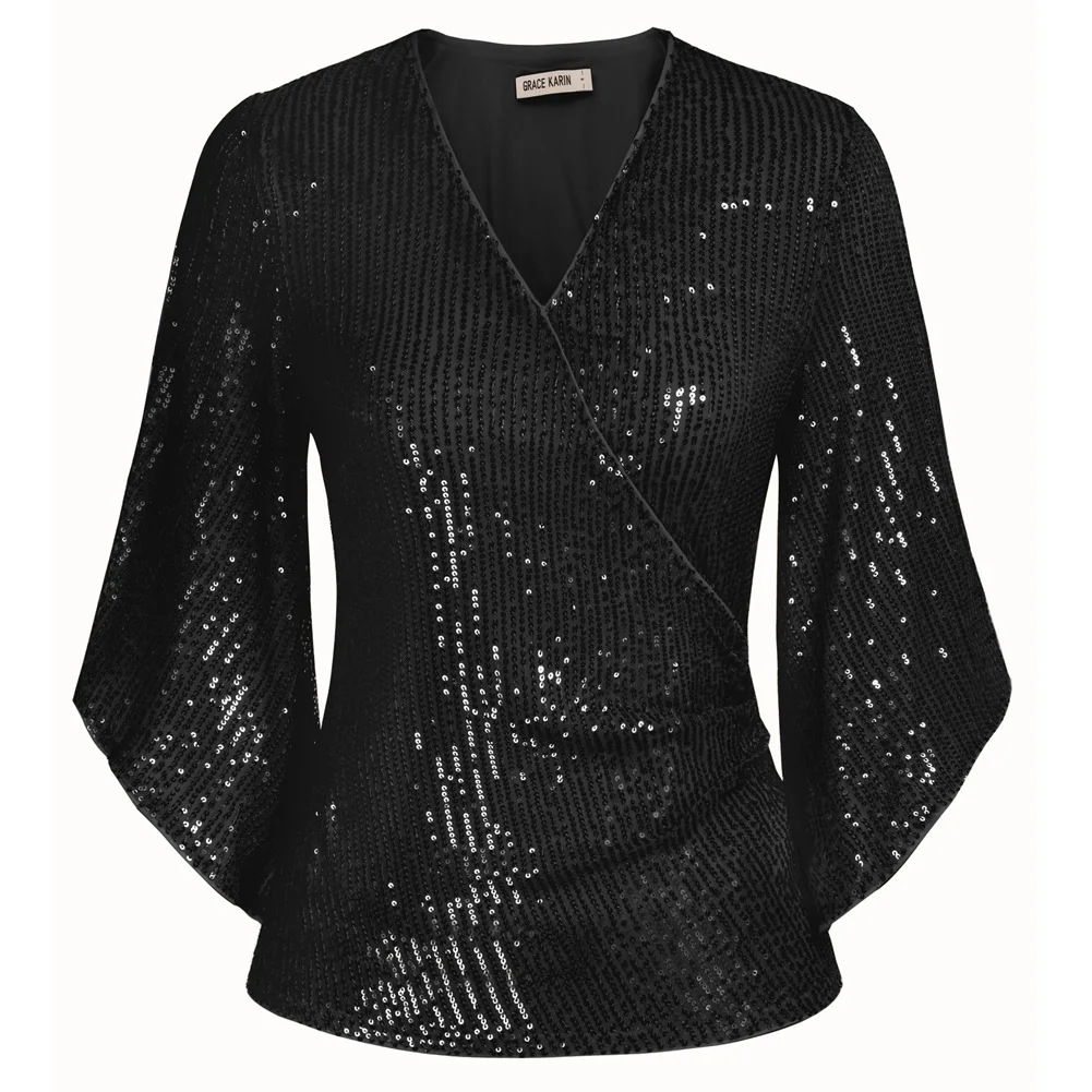 GRACE KARIN Damen Pailletten Top - Glitzer Party Bluse Kurzarm