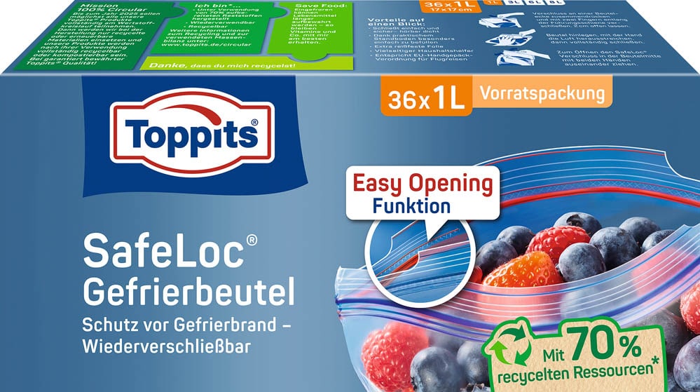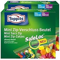 Kennst du das? Du frierst was ein und nach paar Wochen ist alles voll mit Eiskristallen? Mit den Toppits SafeLoc Beuteln gehört das der Vergangenheit an! Die Jungs sind richtig dick gemacht und reißen dir nicht so schnell ein. Und dieser Doppelverschluss - der macht richtig 'klick' wenn er zu ist, da geht nix mehr auf!